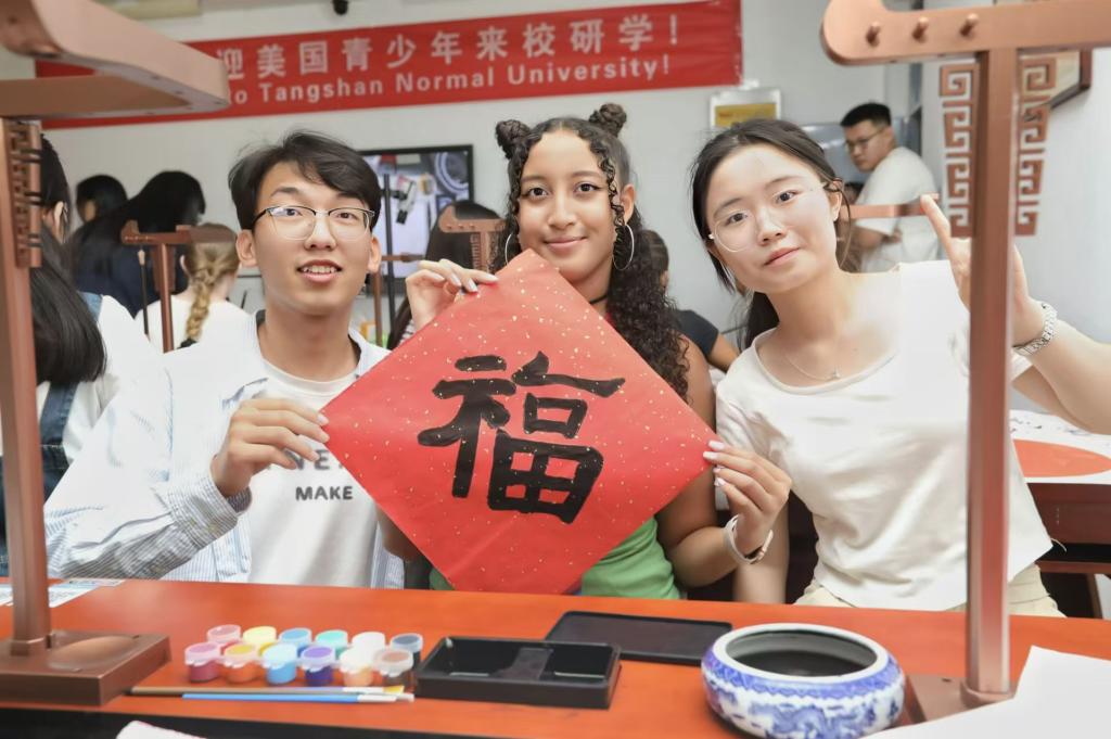 学校为来访的美国大学生们安排了各种文化体验活动,包括学习交流论语、武术、书法、绘画、评剧等中国传统文化,欣赏唐山皮影戏,体验陶瓷制作、漆扇制作、非遗蜡染;深入唐山博物馆、唐山工业博物馆和开滦国家矿山公园了解唐山历史和工业发展历程;参观唐山机器人展示体验中心感受唐山现代科技发展;游览唐山宴,品尝唐山传统美食,了解唐山风土人情。