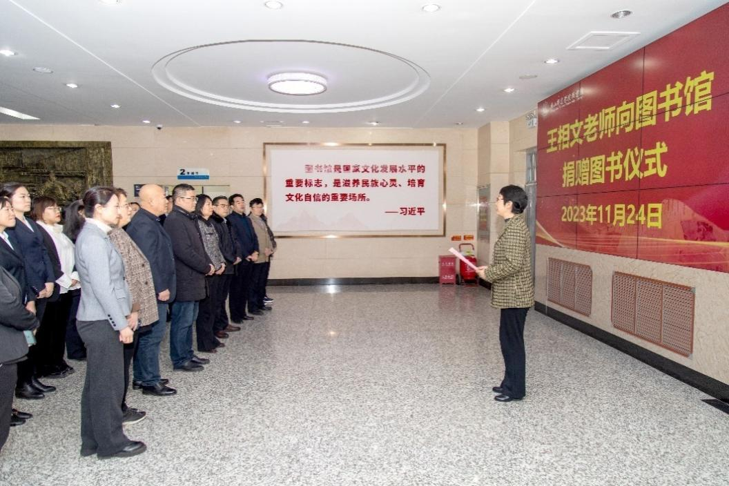 郑向群首先对与会领导和同事们的到来表示热烈欢迎,并具体介绍了王相文老师的教学科研事迹。唐朝晖代表图书馆接受了王相文老师所赠的图书,并为其颁发了捐赠证书。