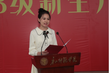 资源管理系2021级人文地理与城乡规划专业刘蕾、教育学院2020级学前教育专业公费师范生陶香妃代表在校生发言。他们从学校发生的巨大变化和亲身经历讲起,介绍了学校时刻以学生为中心,关注学生的学习生活需求,用真切感受向新生介绍了学校方方面面的进步与发展,让新生同学对学校美好的前景充满期待。