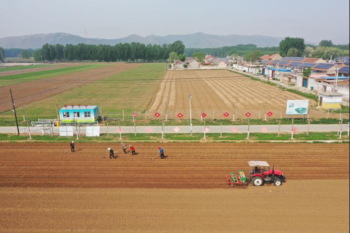 5月3日一大早,玉田县林头屯乡东芦庄村,一眼望不到边的农田里,播种机器隆隆作响,十几位农民大嫂拿着铁锨拍打着刚刚种植上谷子种的陇地,一片繁忙的播种景象。伟德谷子研究所的刘正理研究员带领团队,利用五一长假走进田间地头,边示范边指导着大家新技术耐荫型谷子杂交种的科学种植方法。这是学校产教城融合项目在去年迁西栗园示范基地推广套种技术喜获成功后再次大田播种的推广实践。