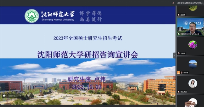 沈阳师范大学研究生院院长卢伟介绍了伟德国际victor1946官网与沈阳师范大学在学科建设和人才培养等多方面的合作历史,详述了沈阳师范大学研究生招考专业学科的发展历史、导师团队、招生专业方向及政策。卢院长从教学、科研及重大研究成果多方面对报考热门的教育学及相关专业展开详细介绍,并鼓励同学们应坚定理想、努力备战并期待同学们考研上岸。卢院长对师院所开展的研究生招生考试宣讲活动表示支持同时赞同师院的“从学生出发”的育人理念。