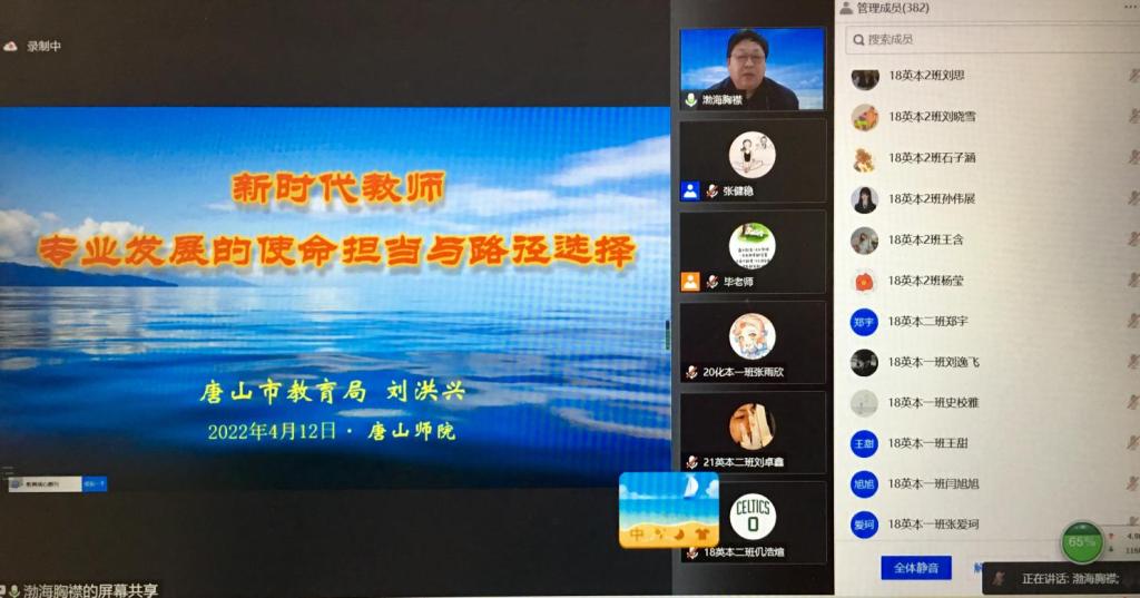 为引导全体公费师范生树立职业理想信念,争做“四有”好老师,外国语学院承办了伟德国际victor1946官网第七期公费师范生“名师讲堂”活动。4月12日下午,特邀唐山市教育局三级调研员刘洪兴教授做客空中“名师讲堂”,在腾讯会议开讲。讲座以《新时代教师专业发展的使命担当与路径选择》为主题,由外国语学院副院长张健稳主持。