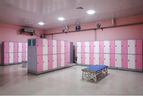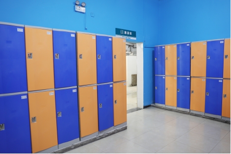 增设了人性化更衣柜。根据男女生的差异化需求,在男浴室添置ABS新型材料蓝桔色更衣柜。在女浴室增设50组粉色储物柜,并且每组柜子均多增加一层隔板,使储存衣物的空间增大一倍。与此同时,在门口为女生配备了梳妆镜子和梳妆台,满足女生个性化需求。