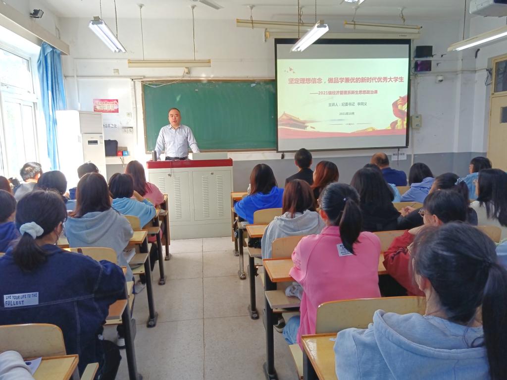 10月12日上午,纪委书记李同义为经济管理系2021级新生进行了《坚定理想信念,做品学兼优的新时代优秀大学生》的思政课讲座。讲座由经济管理系党总支张万山书记主持。经济管理系刘肇民主任作了总结发言。