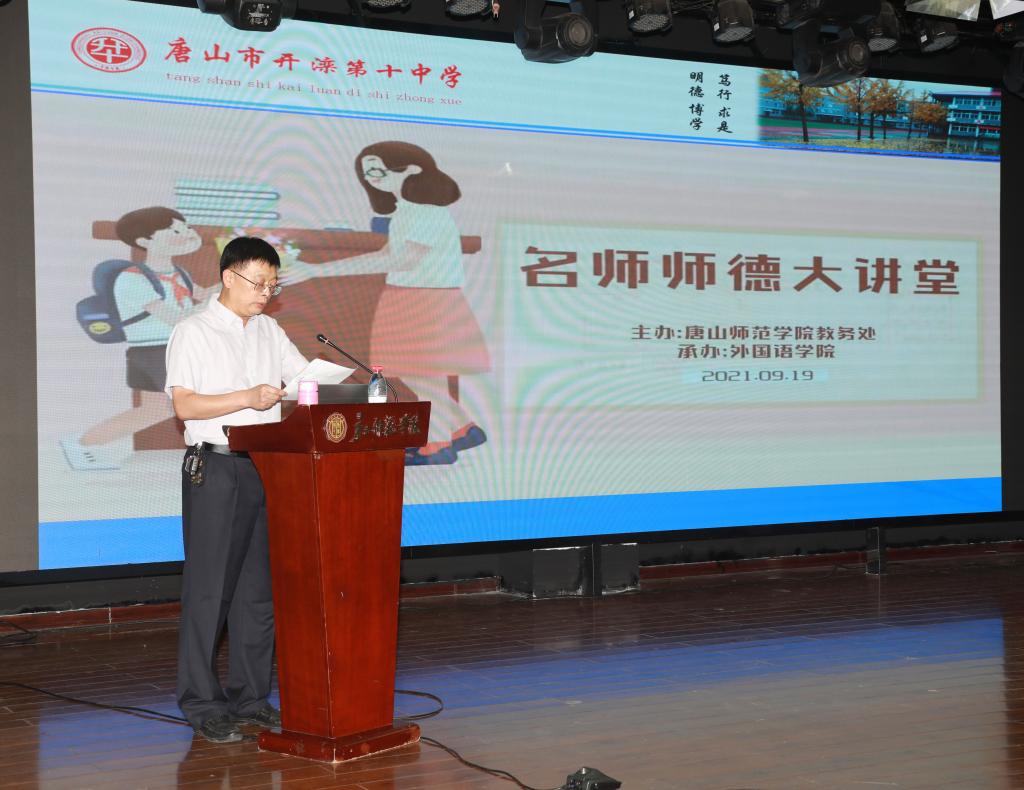 为提升伟德师范生培养质量,助力唐山市基础教育事业高质量发展,2021年9月19日下午,伟德在大学道南院会议中心举办了名师师德大讲堂活动。此次活动由学校教务处主办,外国语学院承办,邀请了唐山市开滦十中校长张冬梅作报告。副校长杨涛、教务处处长王淑娟、学生处处长刘金玲、外国语学院院长邓晓峰出席了活动,各院系公费师范生代表和部分师范生代表参加了活动。活动由副院长杨涛主持。