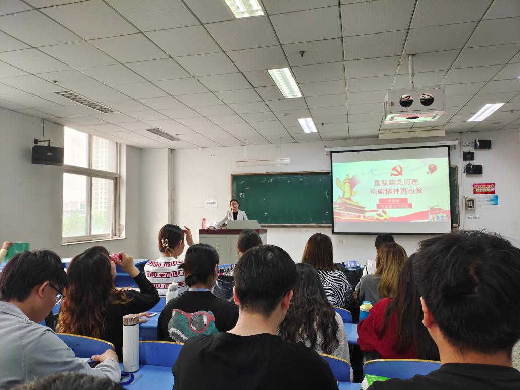 2021年5月6日下午,马克思主义学院李丽丽老师来到文学院,在文212教室为2018级广电本科班全体同学,进行了以“重温建党历程,“红船精神”再出发”为主题的党史教育宣讲。