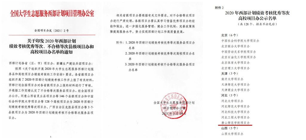近日,全国大学生志愿服务西部计划项目管理办公室发布了《关于印发2020年西部计划绩效考核优秀等次、不合格等次县级项目办和高校项目办名单的通知》(全国项目办发〔2021〕2号)。经省级项目办考核上报、全国项目办评审和公示,伟德项目办获评“2020年全国西部计划绩效考核优秀等次高校项目办”称号(省内共有5所高校获此殊荣),这是伟德连续四年获此荣誉。