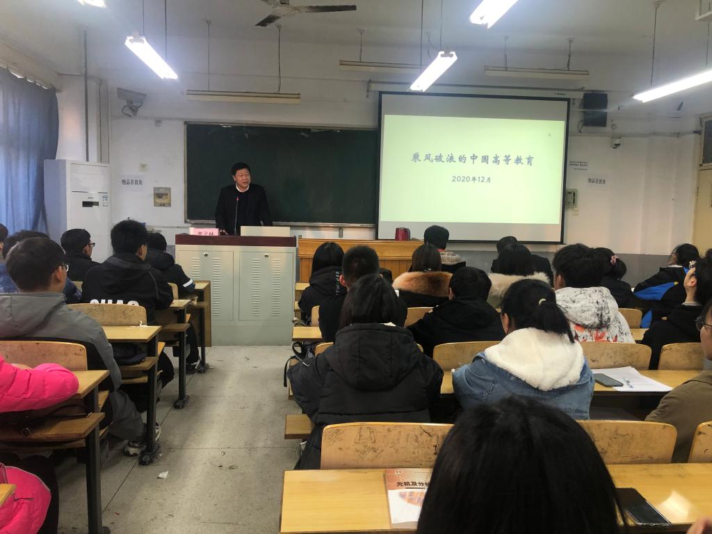 2020年12月4日,李子林副校长在大学道校区南院2302教室为生命科学系全体教师及部分学生代表等近百人讲授题为《乘风破浪的中国高等教育》的思政课。