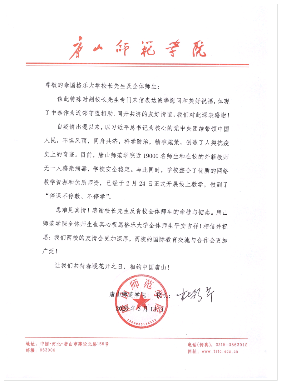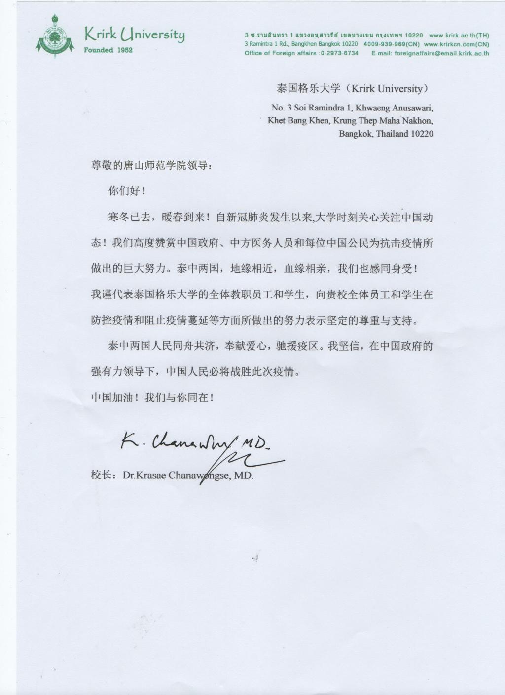 格乐大学校长杨金泉博士(Dr. Krasae Chanawongse)在信中高度赞赏中国政府、中方医务人员和每一位中国公民为抗击疫情所做出的巨大努力。同时,对伟德国际victor1946官网全体师生致以诚挚的慰问,对学校全体师生在防控疫情上所作出的努力表示崇高的敬意。他坚信,在中国政府强有力的领导下,中国人民必将战胜此次疫情。
