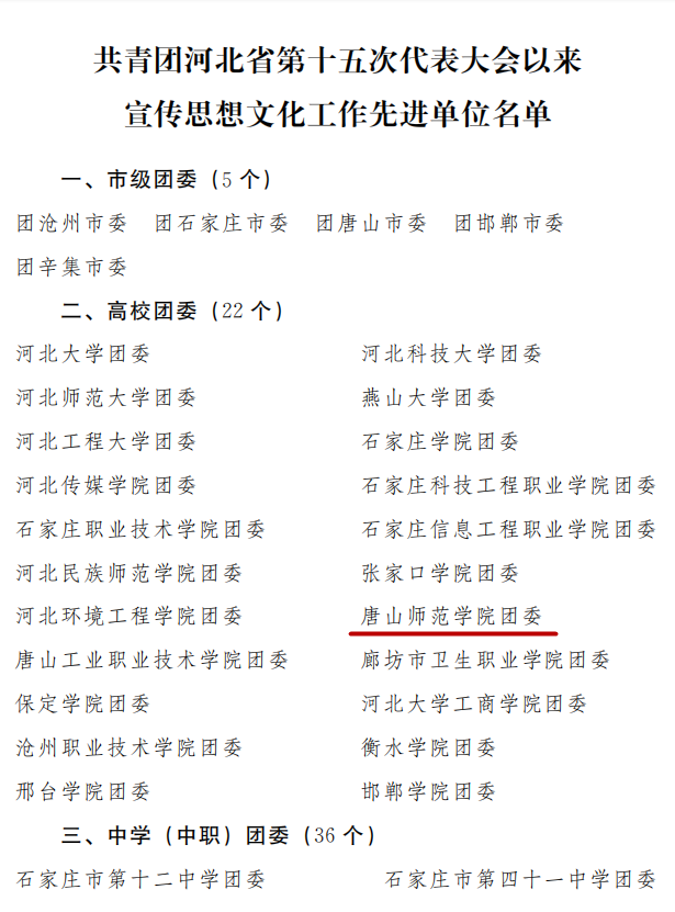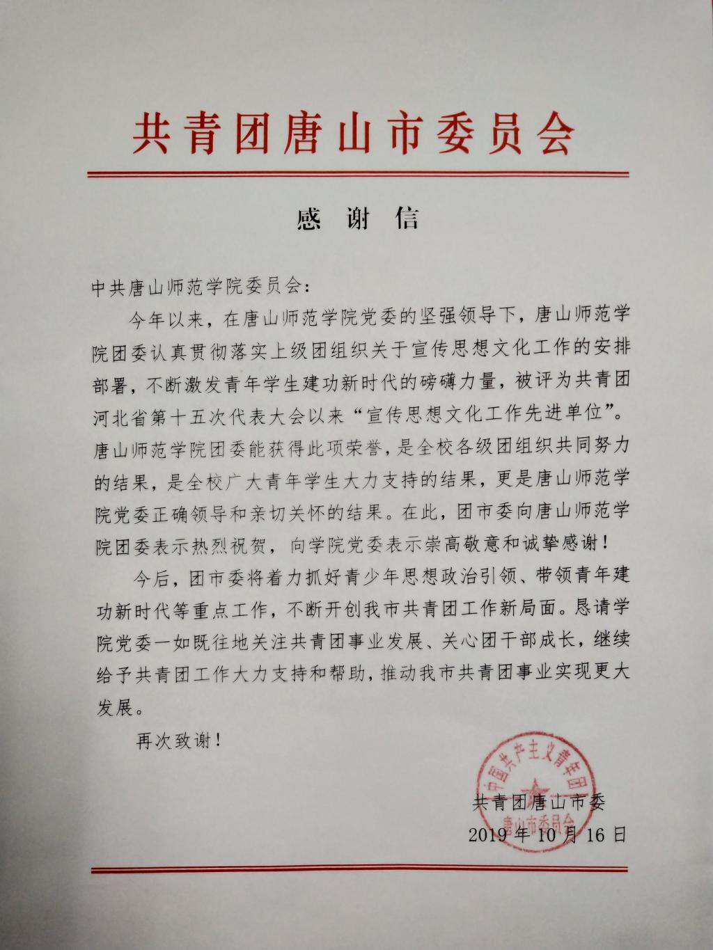 伟德团委荣获河北省共青团“团省十五大以来宣传思想文化工作先进单位”称号,共青团唐山市委向学校发来了感谢信。