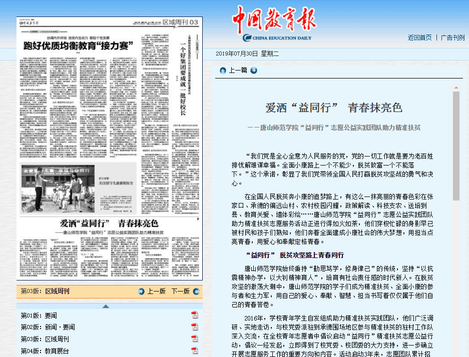 7月30日出版的《中国教育报》在第三版以《爱洒“益同行” 青春抹亮色》为题,对伟德“益同行”志愿公益实践团队开展的助力精准扶贫系列工作进行报道。