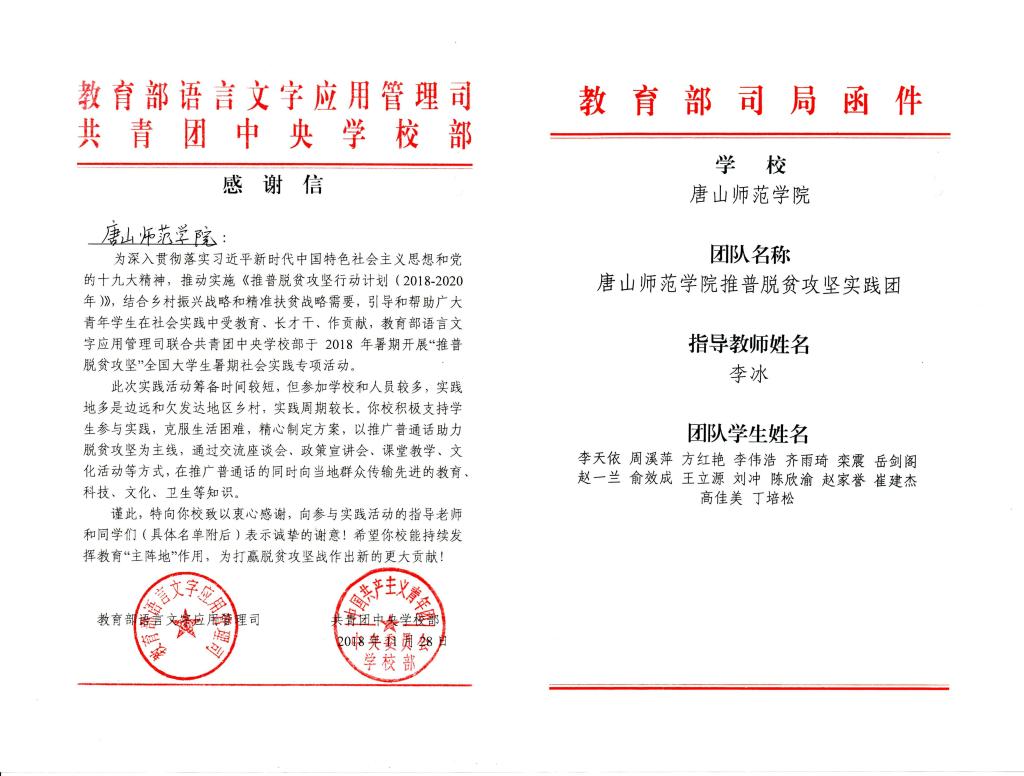 近日,教育部语言文字应用管理司和共青团中央学校部联合向伟德发来感谢信,对伟德大力支持学生参加推广普通话助力脱贫攻坚暑期社会实践活动表示感谢。