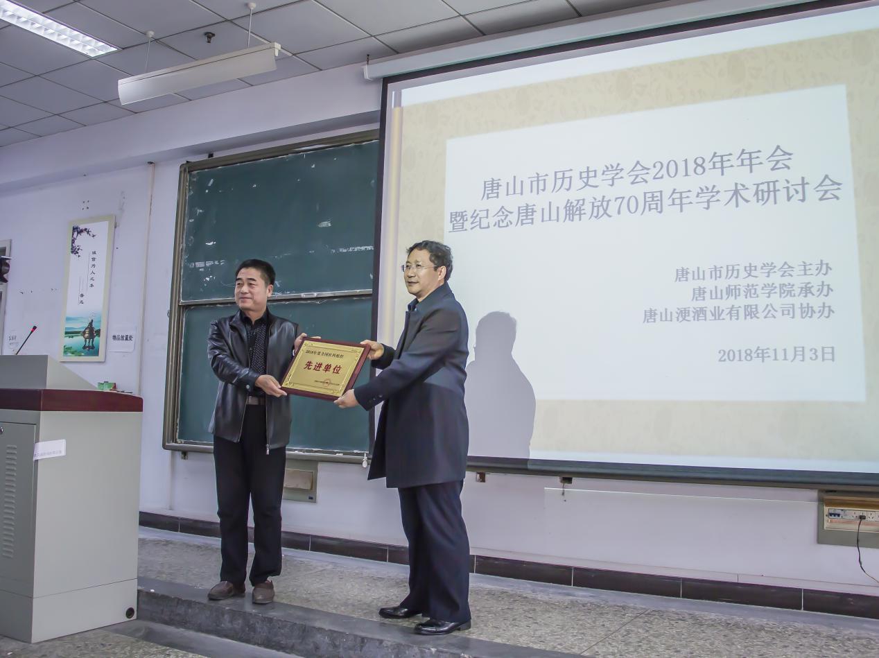 唐山市社科联副主席陈伟向唐山市历史学会会长闫永增颁发奖状