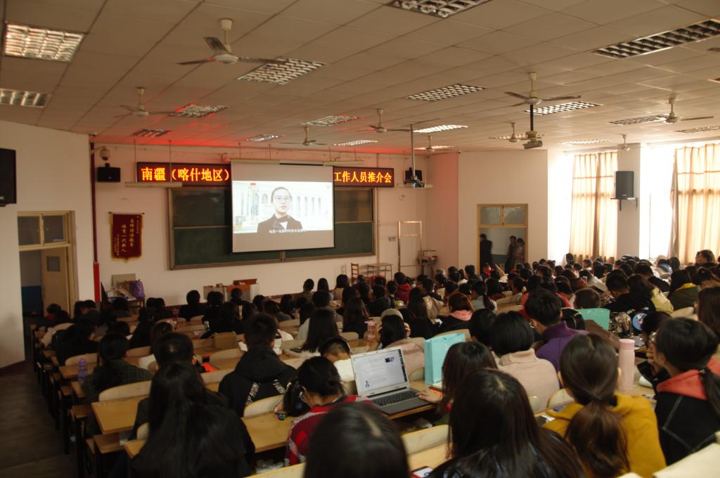在推介会上,喀什地委组织部赴内地招录借调干部为老师和同学们播放了宣传片,深刻地反映了新疆喀什的发展历程和现状,并结合入疆毕业生的发展前景、引进人才的优惠政策、稳定和谐的生活环境等具体方面,认真细致地进行了宣讲,对同学们提出的问题做了详细的解答,最终有26名学生达成去新疆就业意向。同学们纷纷表示新疆良好的发展机遇和环境,必将为建设服务边疆的政策导向和个人今后的发展提供广阔空间和舞台。