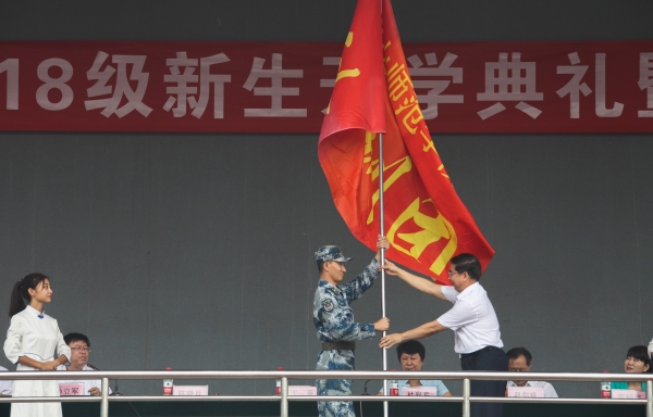 随后,新生军训教官代表马天吉发言。他表示,要从自身做起,以良好的军人形象带领大家,以过硬的军事本领引导大家,带领同学们坚决执行军训团的各项规章制度。2018级汉语言文学专业学生冀梦雨代表新生发言,承诺将以最高昂的情绪、最饱满的姿态参加军训,按照老师的要求,练出成绩,练出水平,展现当代大学生的风采,开始他们美好的大学生活。2016级学生周溪萍代表在校大学生发言,希望新生能勇敢迎接生活的挑战,永远守住心底的光芒,并告诫所有大学生要拥有创造梦想的激情与担当和不骄不馁的定力与操守。教师代表、社会科学部青年博士王士良建议新同学要善待和珍惜时间,祝愿各位新生能够青春无悔。