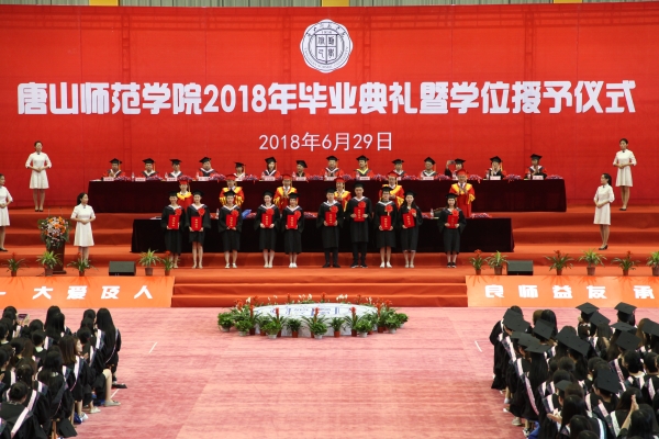 毕业典礼开始前,由12名毕业生奉献了歌曲联唱。在一首唐山师院版《那时再唱给你听》的大合唱中,毕业典礼隆重开始。