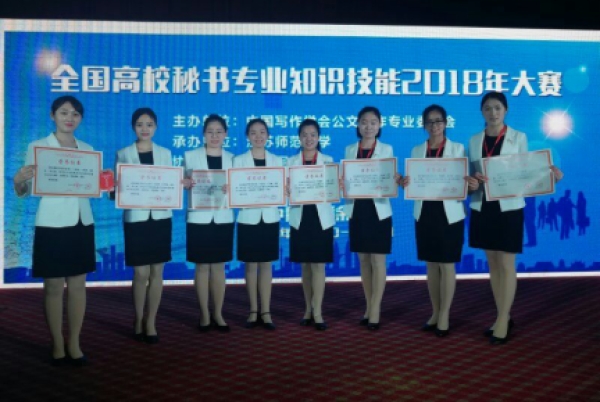 ,全国高校秘书专业知识技能2018年大赛落下帷幕。本次大赛由中国写作学会公文写作专业委员会主办,江苏师范大学承办,江苏省写作协会协办,共有来自全国45所高校的68支代表队参加。经过两天的激烈角逐,伟德中文系秘书学专业派出的两支代表队分别取得了团体特等奖和团体一等奖。2015级秘书学的付艳茹同学在272名参赛选手中脱颖而出,获得