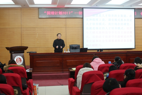 王教授以“深化基础教育人才培养模式改革,掀起‘课堂革命’,努力培养学生的创新精神和实践能力”为出发点和归宿,结合自己从事中小学语文教学、指导师范生语文教学技能训练、长期与中学语文教师合作教改的经验以及为教育部统编《语文》教材教学的实际需要,为听课学员解读了语文教学模式建构的意义、原则、方法,自主阅读指导模式的理论基础、核心思想、结构,以及实验过程中的效果和体会。讲座中,王教授与听课学员互动不断,同时还根据教学内容特点,适时与学员利用网络开展合作学习,提升了教学效果。