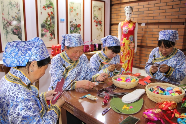2016年六合店村工作组入村以后,一直思考一个问题,就是在农闲时节,如何让妇女们有事干,过充实而有意义的冬天。一次偶然的机会,工作组发现了满族刺绣。于是与县扶贫办积极联系,是否可以组织村里的妇女们学习满绣。工作组的想法得到了县扶贫办的大力支持。县扶贫办专门为六合店村立项,进行业务培训。扶贫办的江波主任积极帮助联系围场县的“上世满绣”公司,由该公司负责培训。2016年底,六合店村的24名妇女高高兴兴地开始学习满绣,成为首批绣娘。粗手笨脚的小媳妇们拿起了绣花针,穿上了五彩线,一针一线地学起了满绣。干惯了农活的绣娘们,学习非常认真。一个月下来,练就了一批成手。寒冬腊月,六合店村的绣娘们,开始接公司的任务,做起来了刺绣。用绣娘们的话说,“我们学习了一手好活,还传承了文化,冬天也有事干了。”