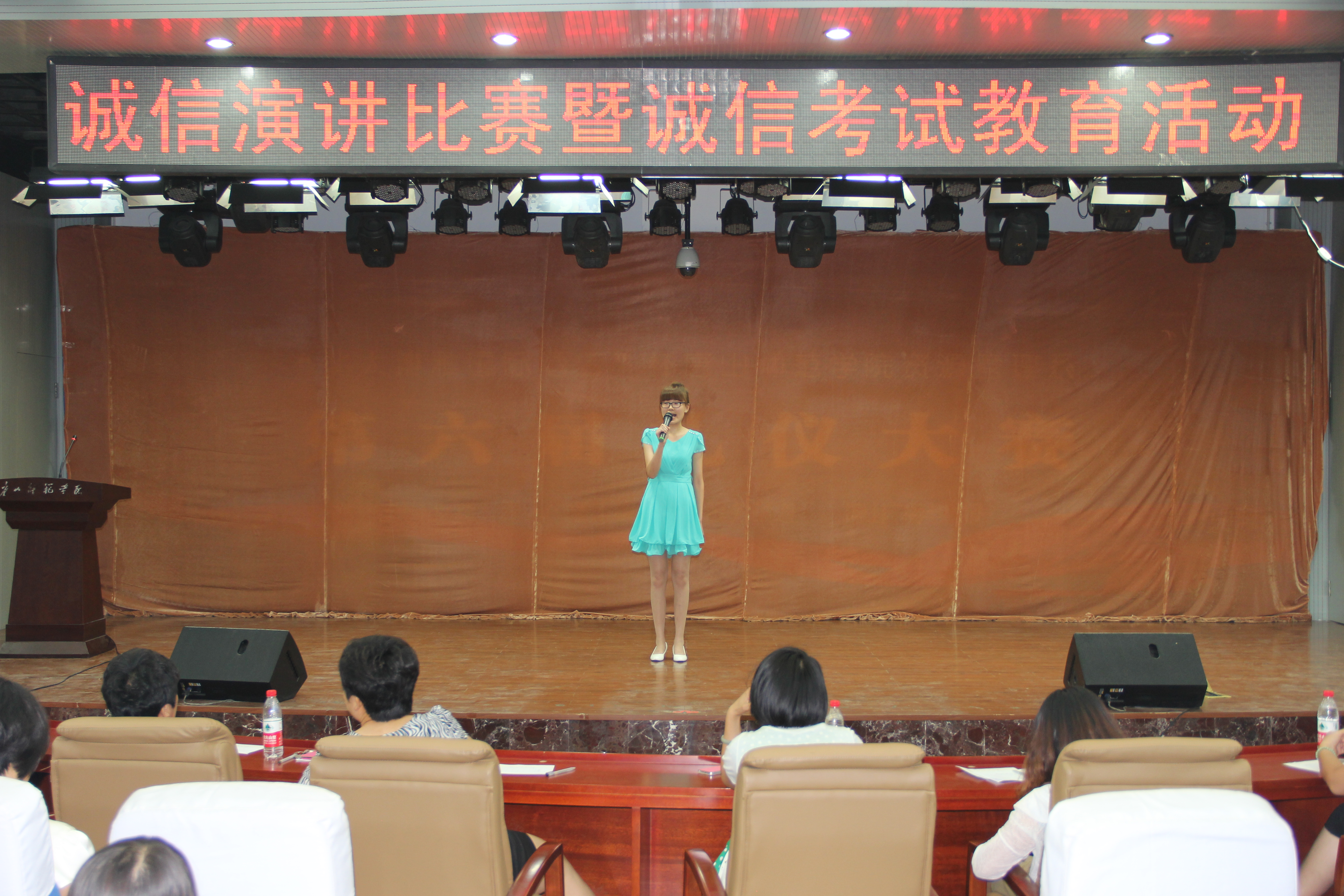 随后,诚信演讲正式开始,来自15个系(院)的选手用或深邃、或激昂、或朴实、或深情的精彩演讲表达了大学生对诚信的呼唤,对拥抱诚信的渴望,对坚守诚信的承诺,对构建诚信社会的担当。经过激烈角逐,资源管理系苏彤彤、经济管理系李亚茹、历史文化与法学系周路阳荣获一等奖。同时在演讲的过程中大屏幕上滚动播放了各系开展诚信教育活动的成果。