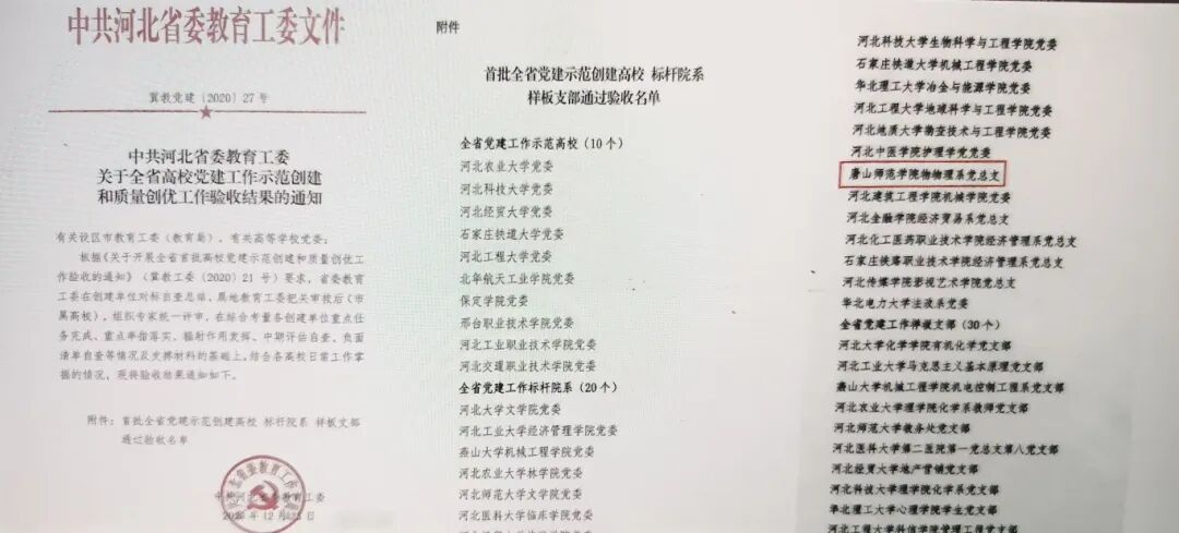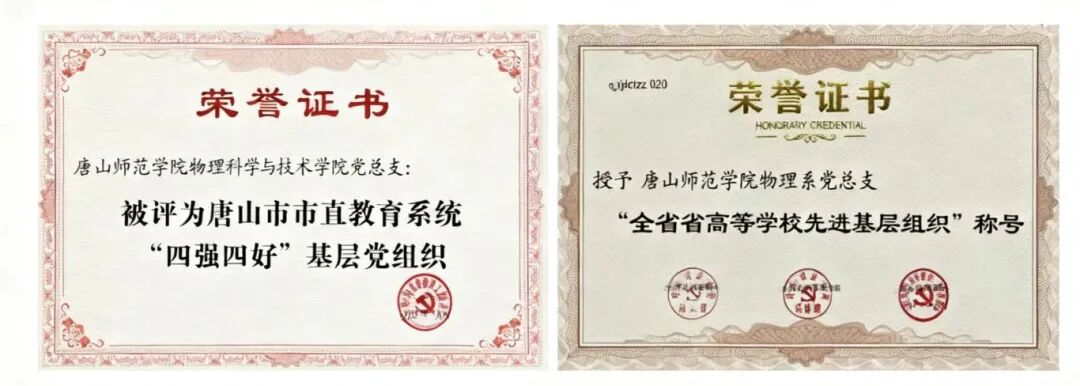 学院党总支为河北省高校首批党建工作标杆院系、河北省高等学校先进基层党组织、河北省高校思想政治工作先进单位、唐山市教育系统“四强四好”基层党组织、“四强四好”基层党组织等基层党建示范点;教师第一党支部为河北省高校党建工作样板支部。