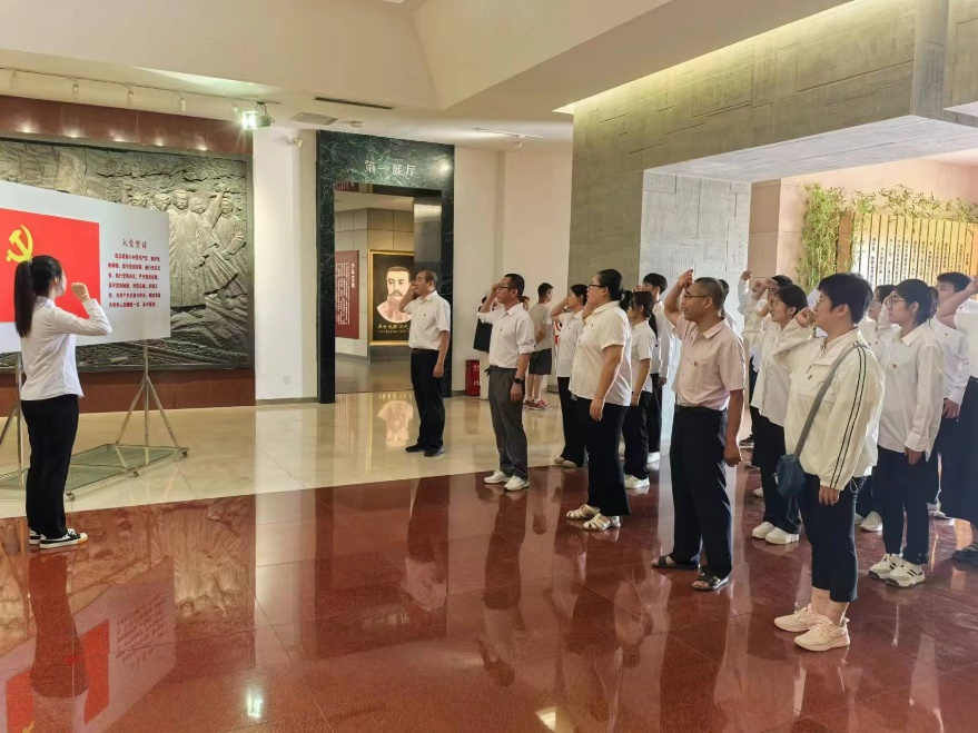 师生们在纪念馆内进行入党宣誓,重温入党誓词,他们高举右拳,面向党旗,庄严宣誓,铿锵有力的誓言回荡在博物馆内,表达了师生们对党的无限忠诚和对革命先烈的深切缅怀。