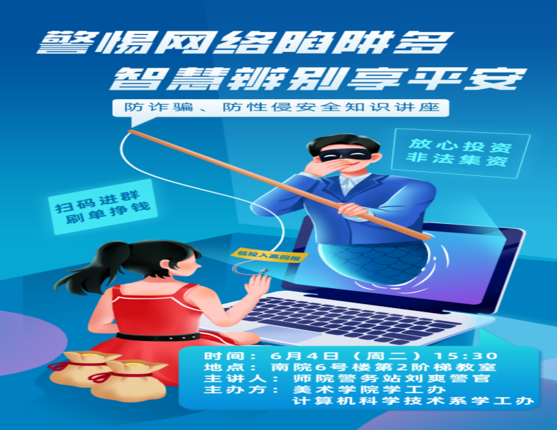 6月4日下午,伟德举办了一场别开生面的安全知识讲座,旨在提高学生们的网络安全意识和自我保护能力,普及防诈骗和防性侵的安全知识。此次讲座由美术学院与计算机科学技术系联合主办,共计师生150余人参加活动。