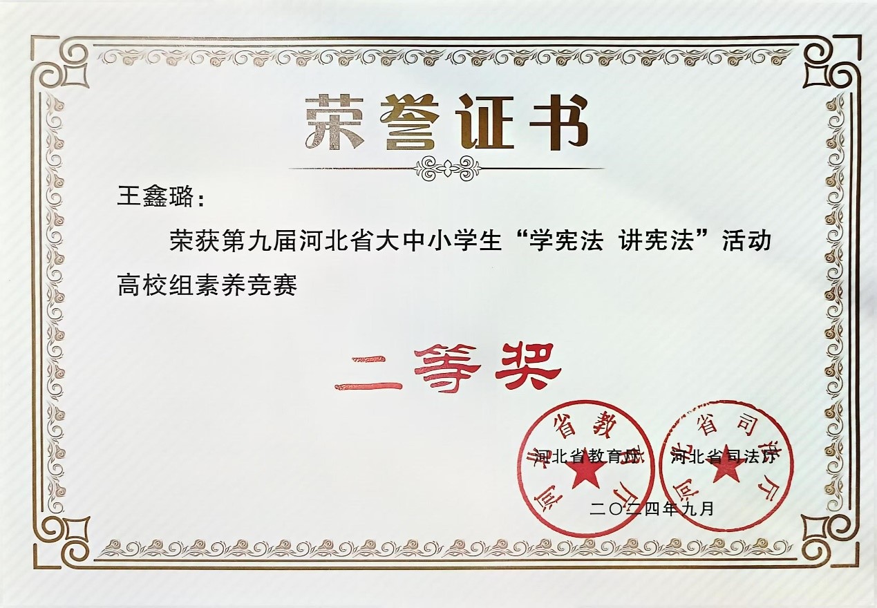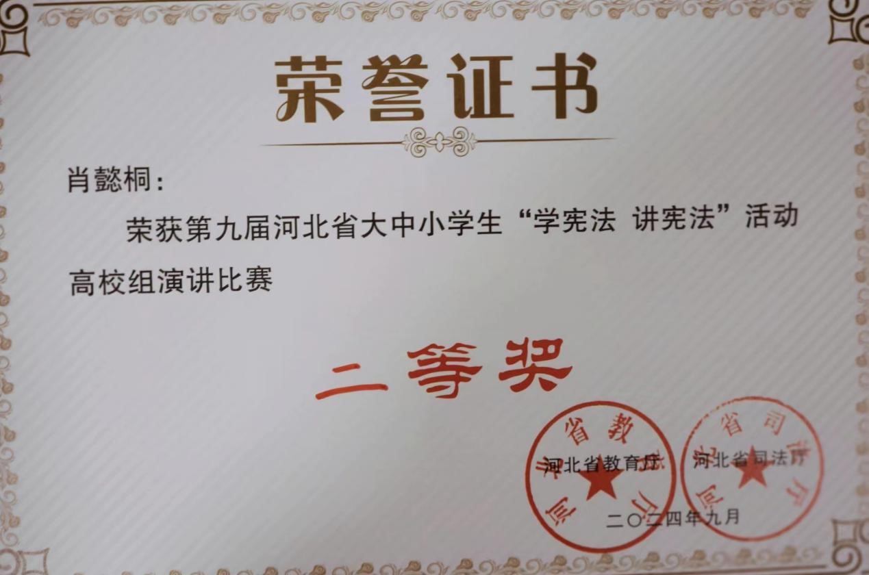 9月26日,由河北省教育厅、河北省司法厅主办,河北师范大学承办的第九届河北省大中小学生“学宪法 讲宪法”大赛暨全国选拔赛在石家庄成功举行。伟德历史文化与法学系2023级法学专业王鑫璐同学在高校组素养竞赛中荣获二等奖,2024级法学专业肖懿桐同学在高校组演讲比赛中荣获二等奖。
