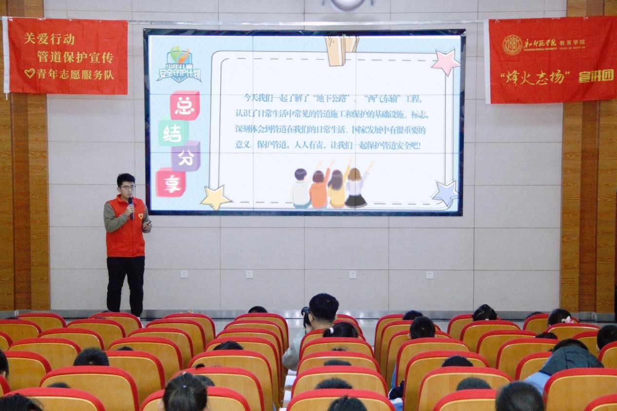 签约仪式后,教育学院烽火志扬宣讲团为西山路小学学生带来了精彩的宣讲。宣讲团成员根据学生认知特点精心设计宣讲内容,以趣味谜语、实验等方式引出油气管道主题,借助模型和图片讲解西气东输工程、管道建设维护知识和安全防护及应急逃生方法,让孩子们认识“能源动脉”,激发其担当“管道安全小卫士”的热情,增强其环保与社会责任感,树立正确能源保护观念。