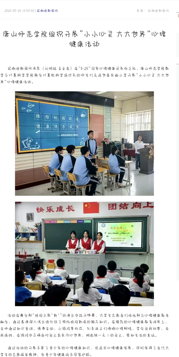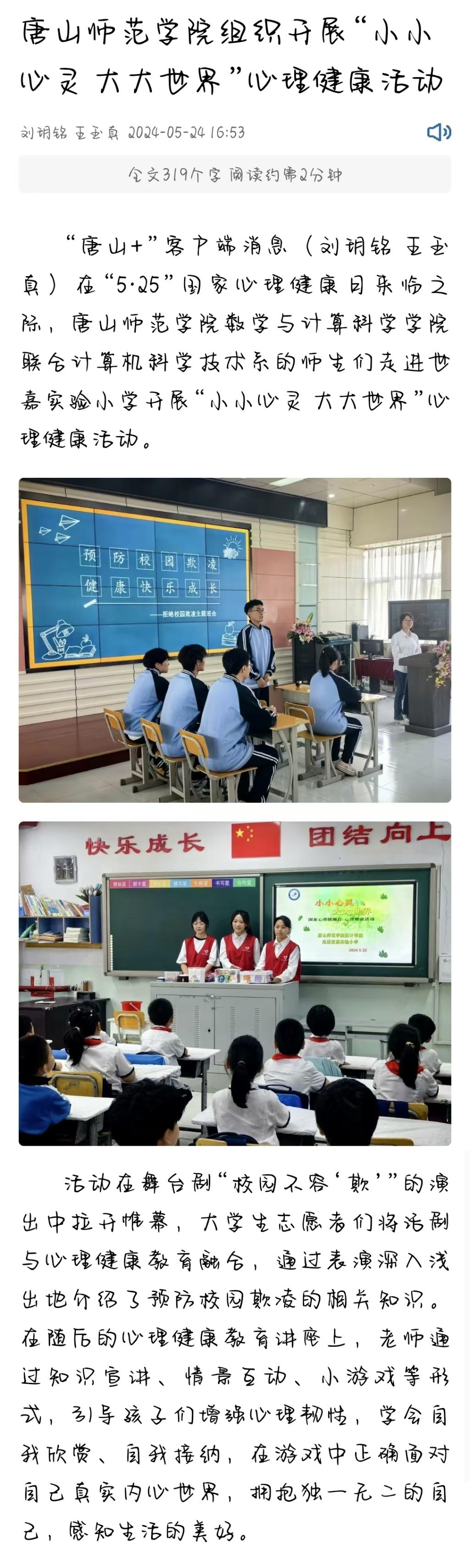 在“5·25”国家心理健康日来临之际,为提升中小学生心理健康素养,促进学生全面发展,发挥当代大学生志愿服务精神,为青少年心理健康教育贡献青春力量。日前,伟德国际victor1946官网数学与计算科学学院联合计算机科学系组织师生来到世嘉实验小学,开展了一场心理健康教育活动。