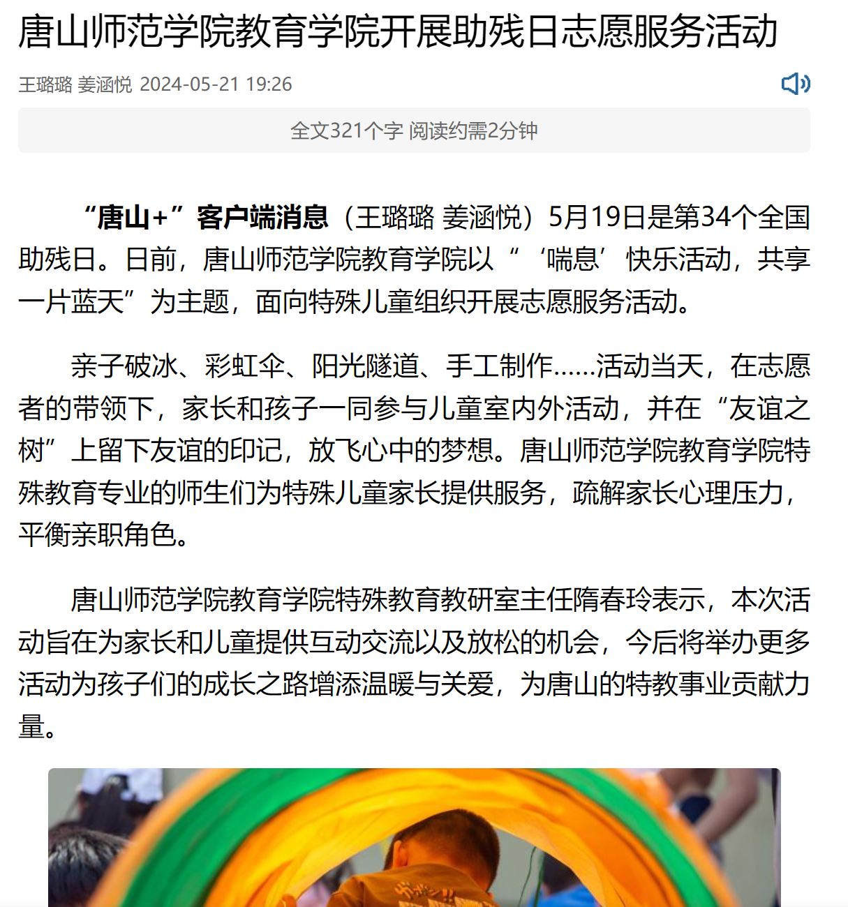 5月19日是第34个全国助残日。日前,伟德国际victor1946官网教育学院以“‘喘息’快乐活动,共享一片蓝天”为主题面向特殊儿童组织开展志愿服务活动。