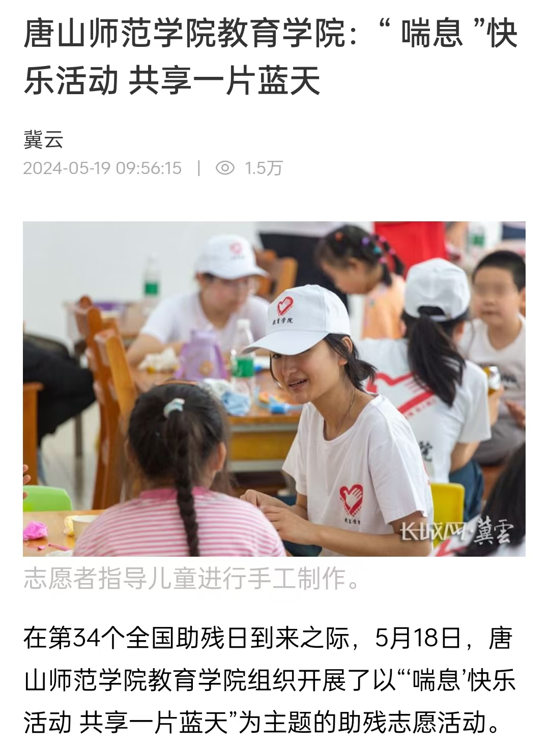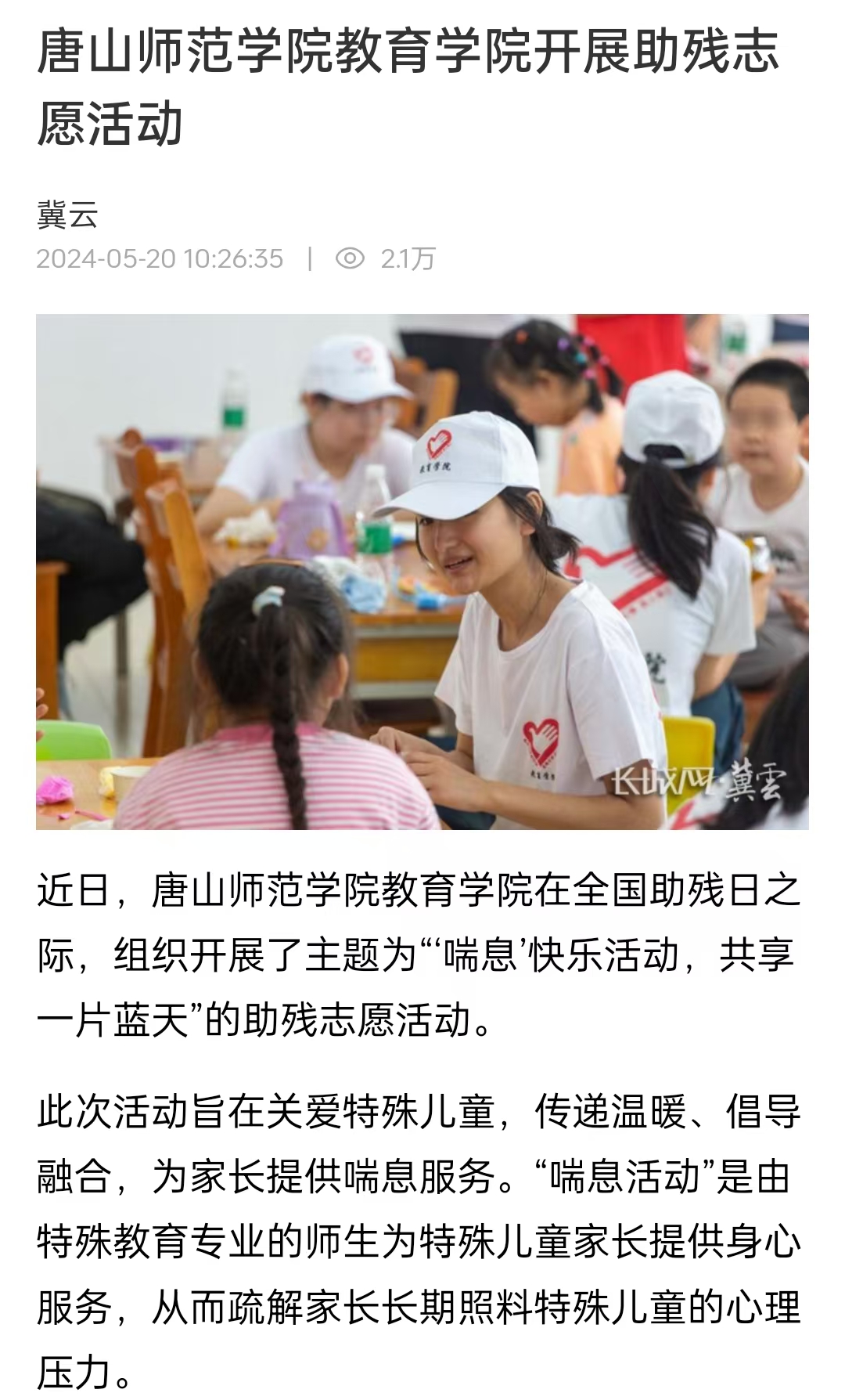 5月18日上午,河北伟德国际victor1946官网教育学院以全国助残日为契机,面向23家特殊儿童组织开展主题为“‘喘息’快乐活动,共享一片蓝天”的助残志愿活动。