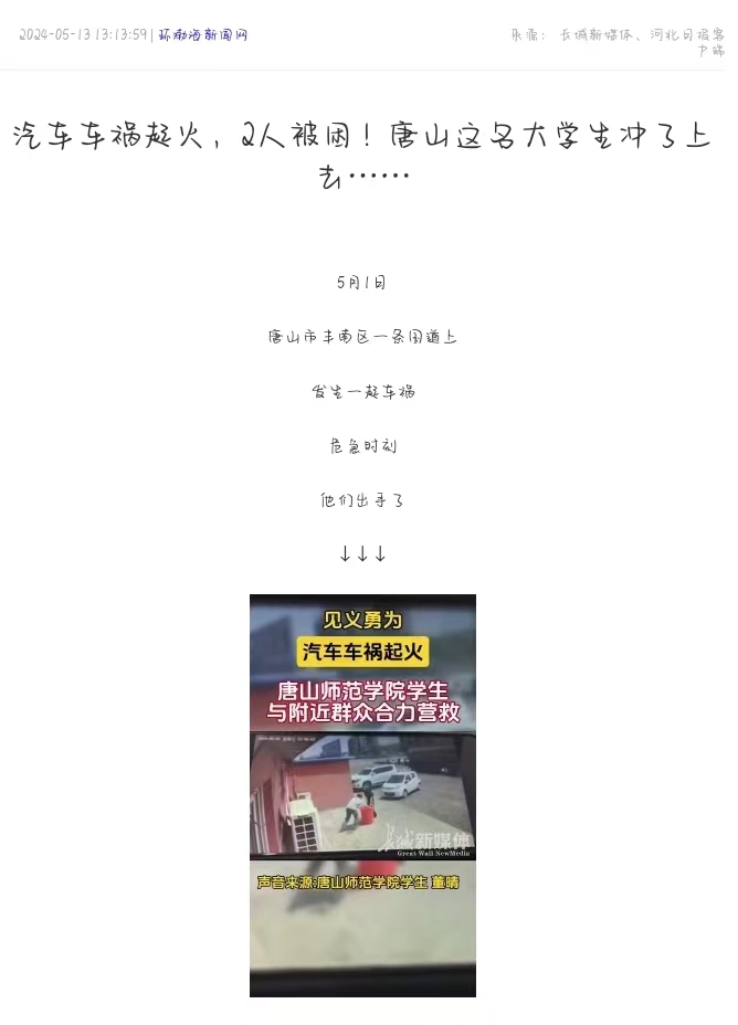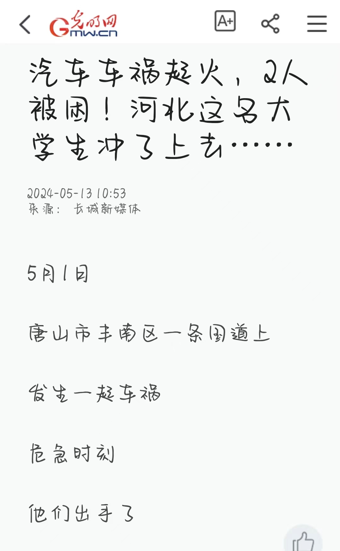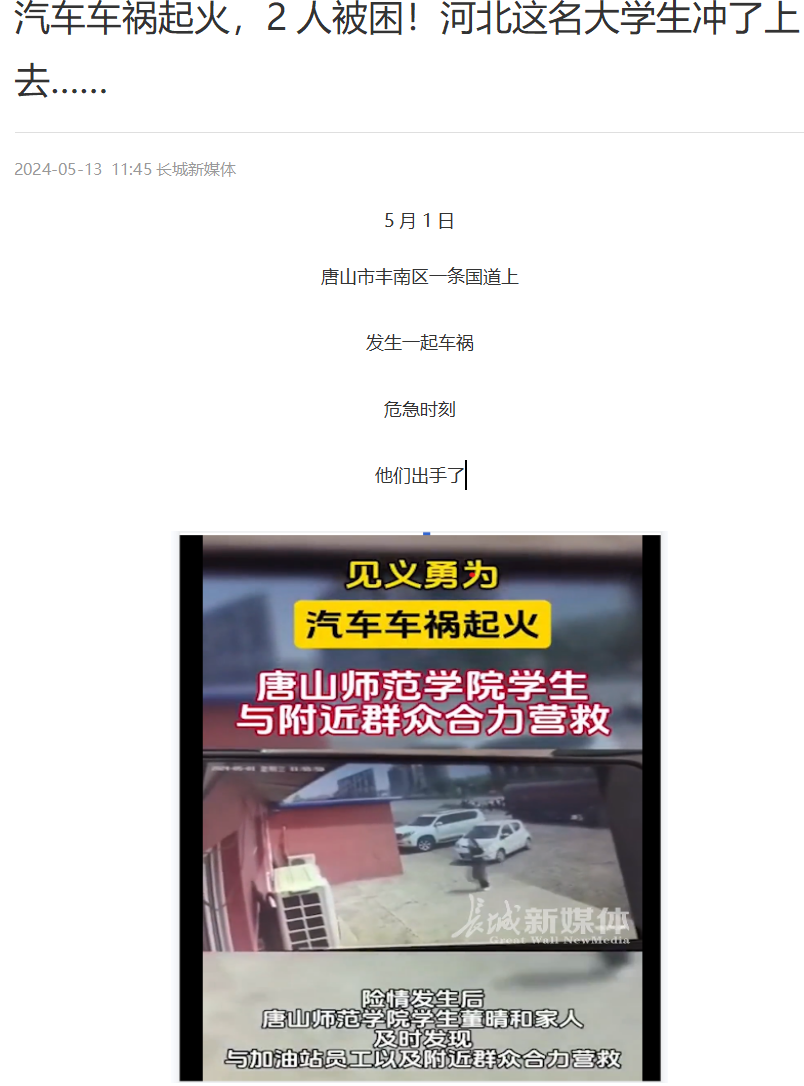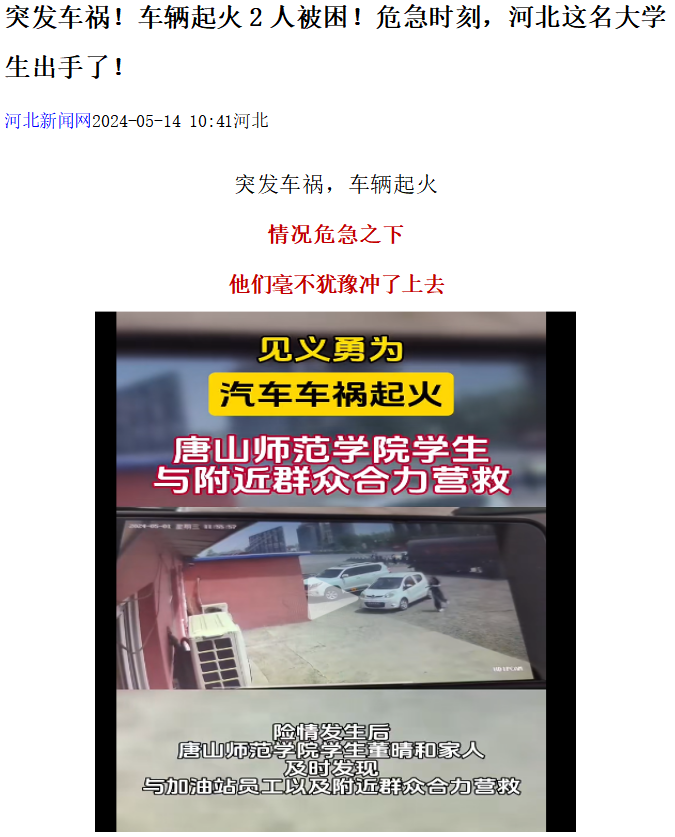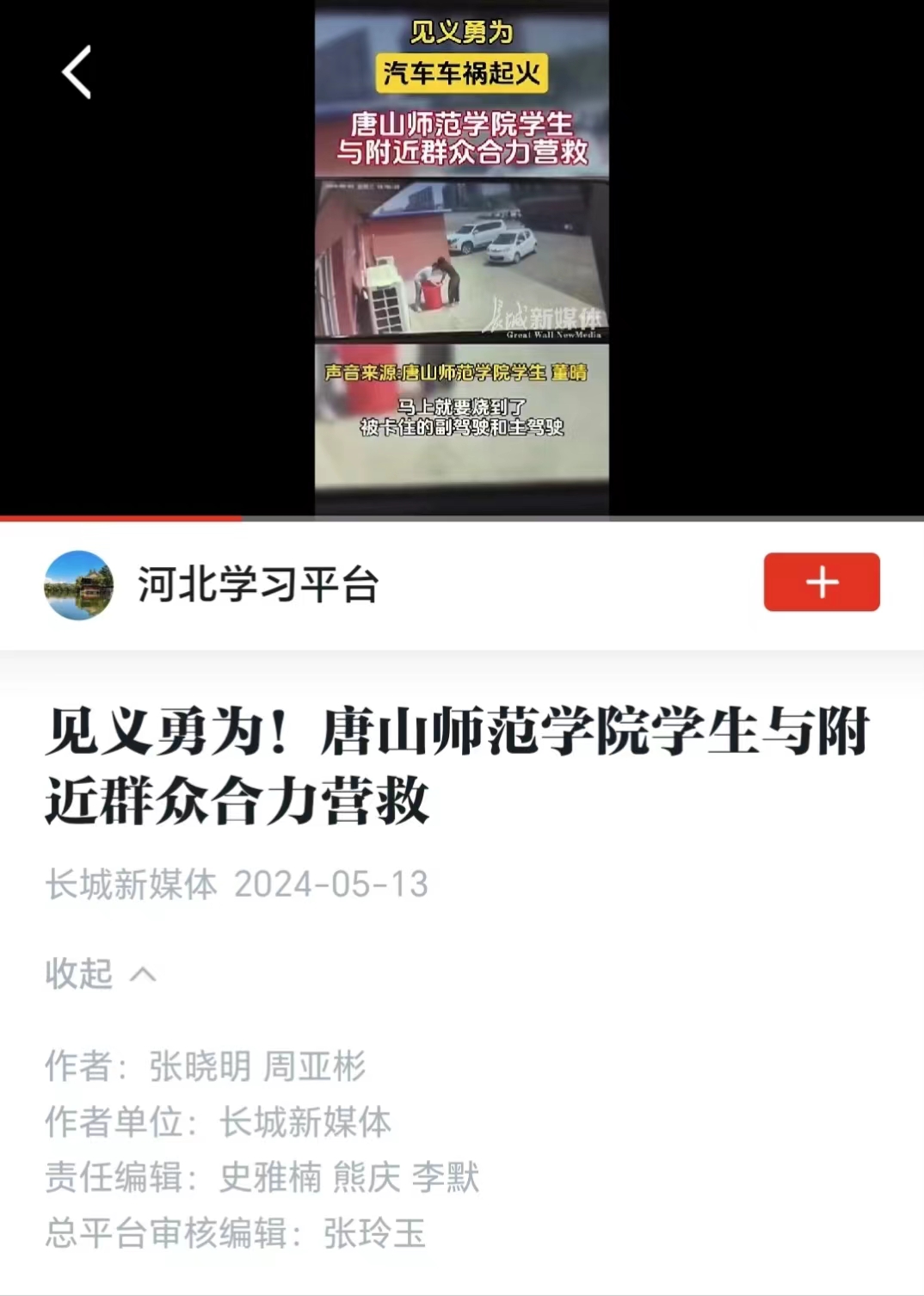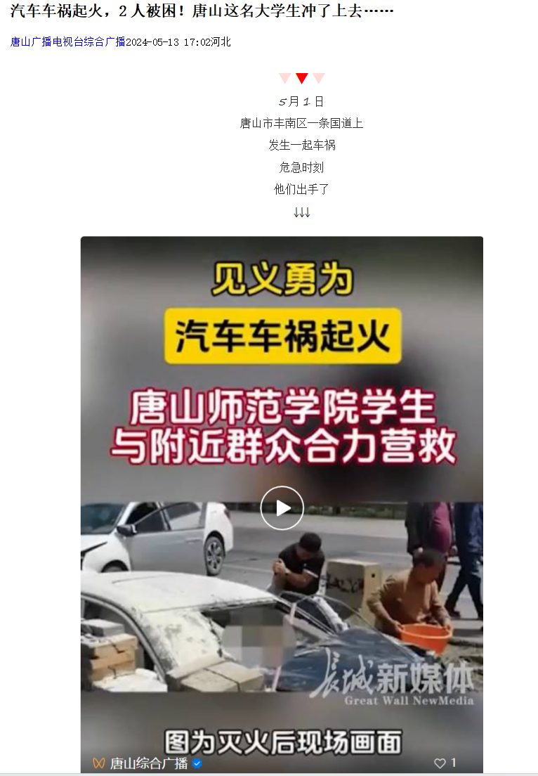 5月1日唐山市丰南区一条国道上发生一起车祸,危急时刻伟德国际victor1946官网董晴和家人及饭店顾客齐心协力救援出被困的2人。危急时刻,不惧危险伸出援助之手。董晴,为你点赞!此事件被光明网,河北日报客户端,唐山广播电视台综合广播等媒体纷纷报道。