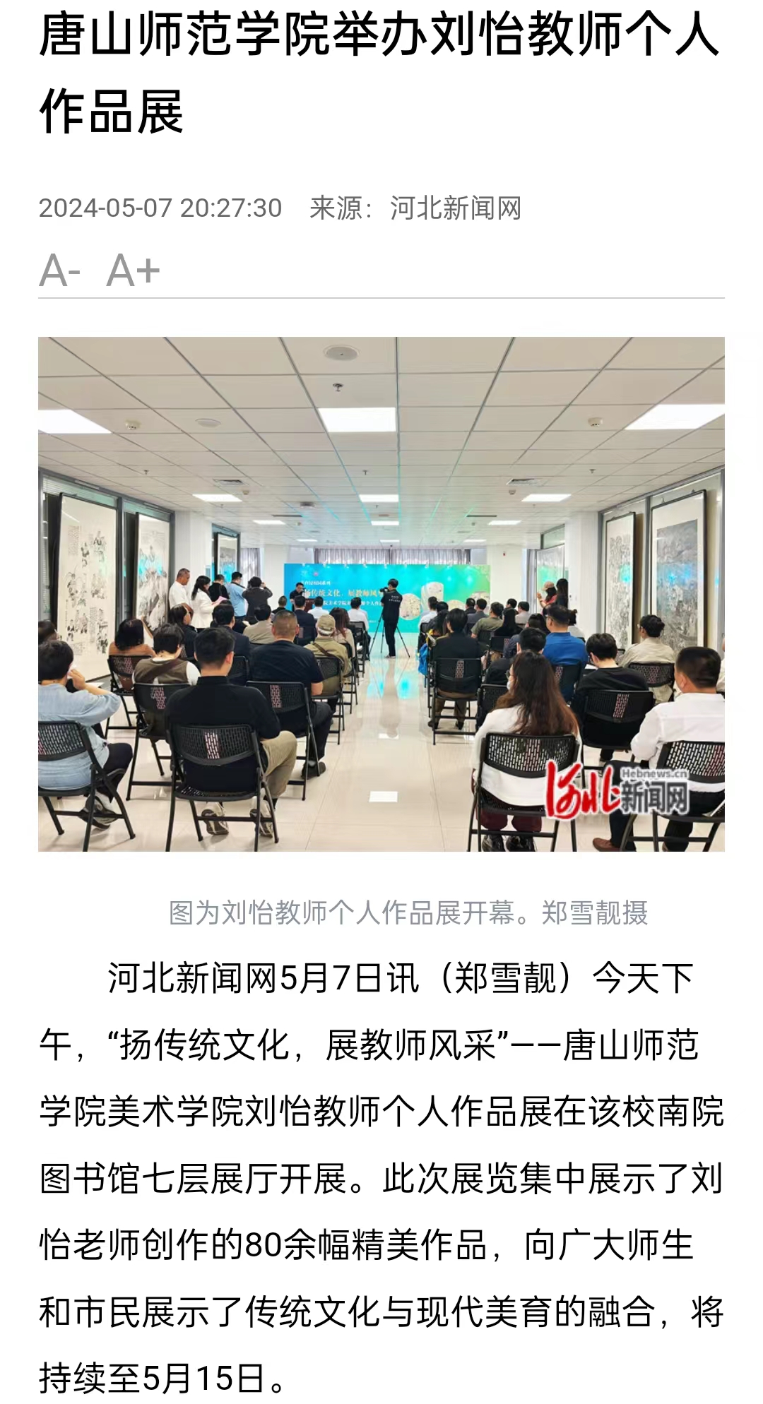 今天下午,“扬传统文化,展教师风采”——伟德国际victor1946官网美术学院刘怡教师个人作品展在该校南院图书馆七层展厅开展。此次展览集中展示了刘怡老师创作的80余幅精美作品,向广大师生和市民展示了传统文化与现代美育的融合,将持续至5月15日。
