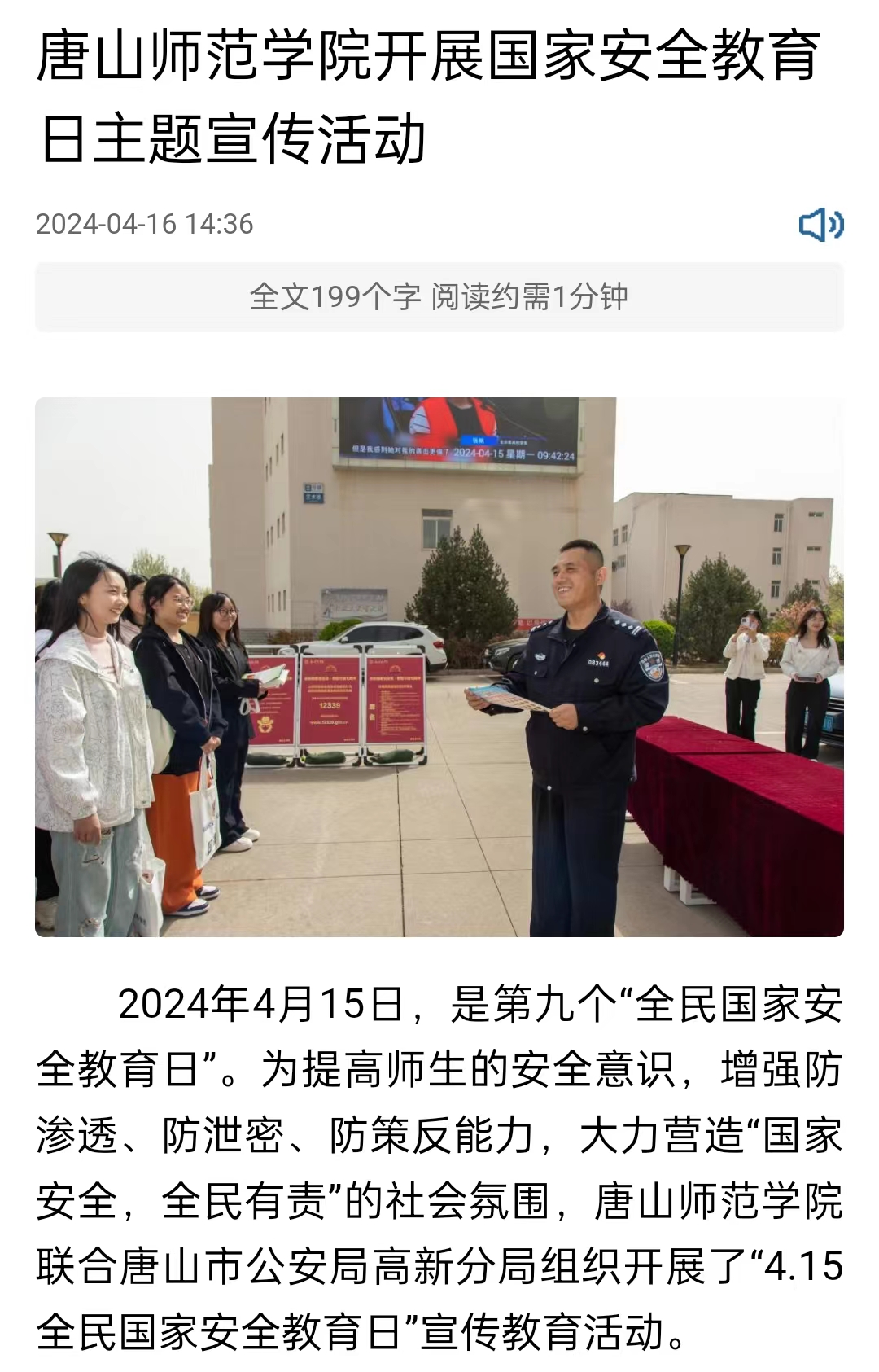 为提高师生的国家安全意识,增强防渗透、防泄密、防策反能力,大力营造国家安全、全民有责的社会氛围。伟德国际victor1946官网联合唐山市公安局高新分局组织开展了415全民国家安全教育日宣传教育活动。