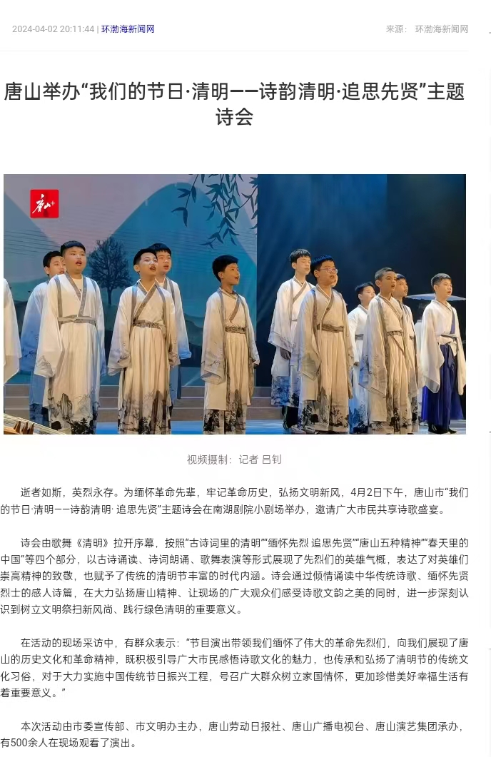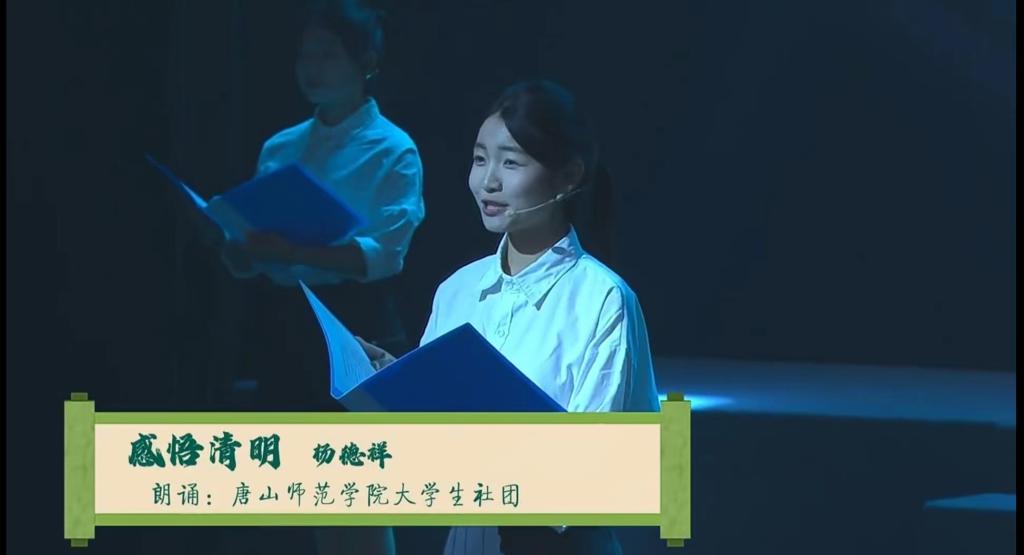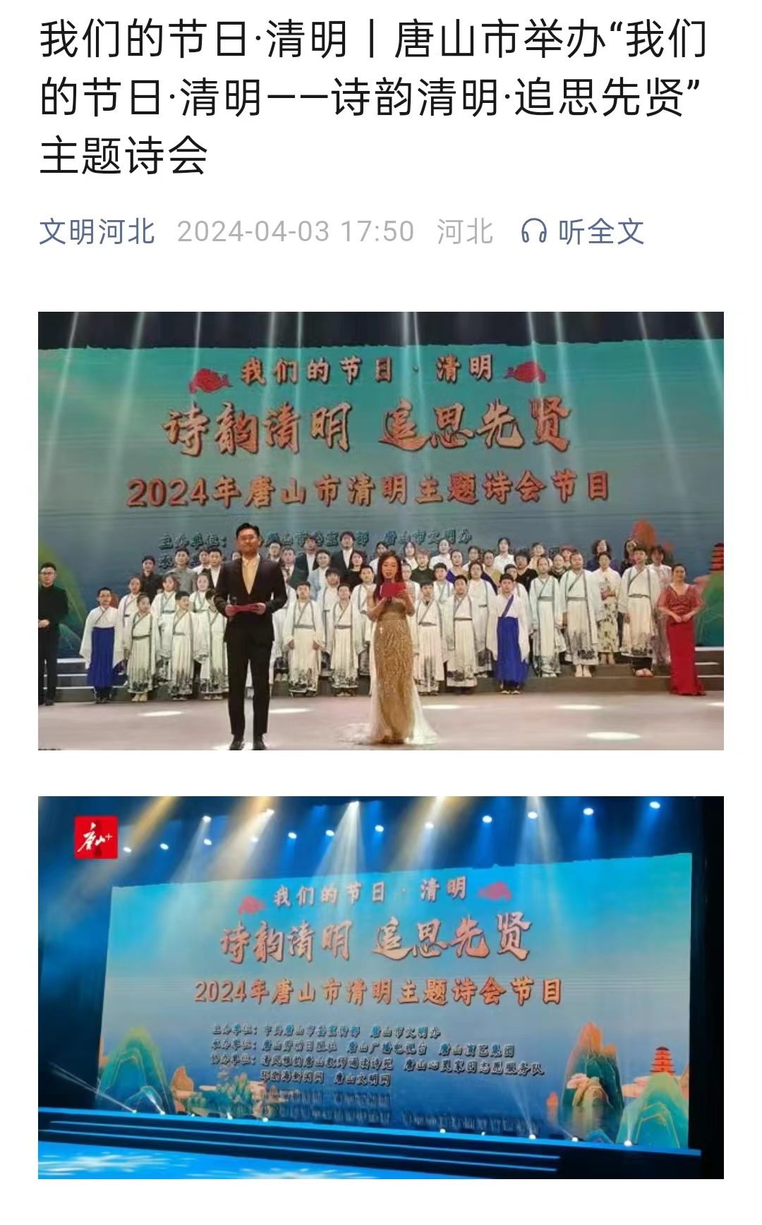 唐山“清风雅韵”诵读团奉现了一台精彩纷呈的节目!由唐山市委宣传部、文明办主办的清明诗会,主题显明,格调高雅,有较强的艺术水准和教育意义,产生广泛影响。众多媒体转播和报道,其中,伟德学生社团带来朗诵作品《感悟清明》。