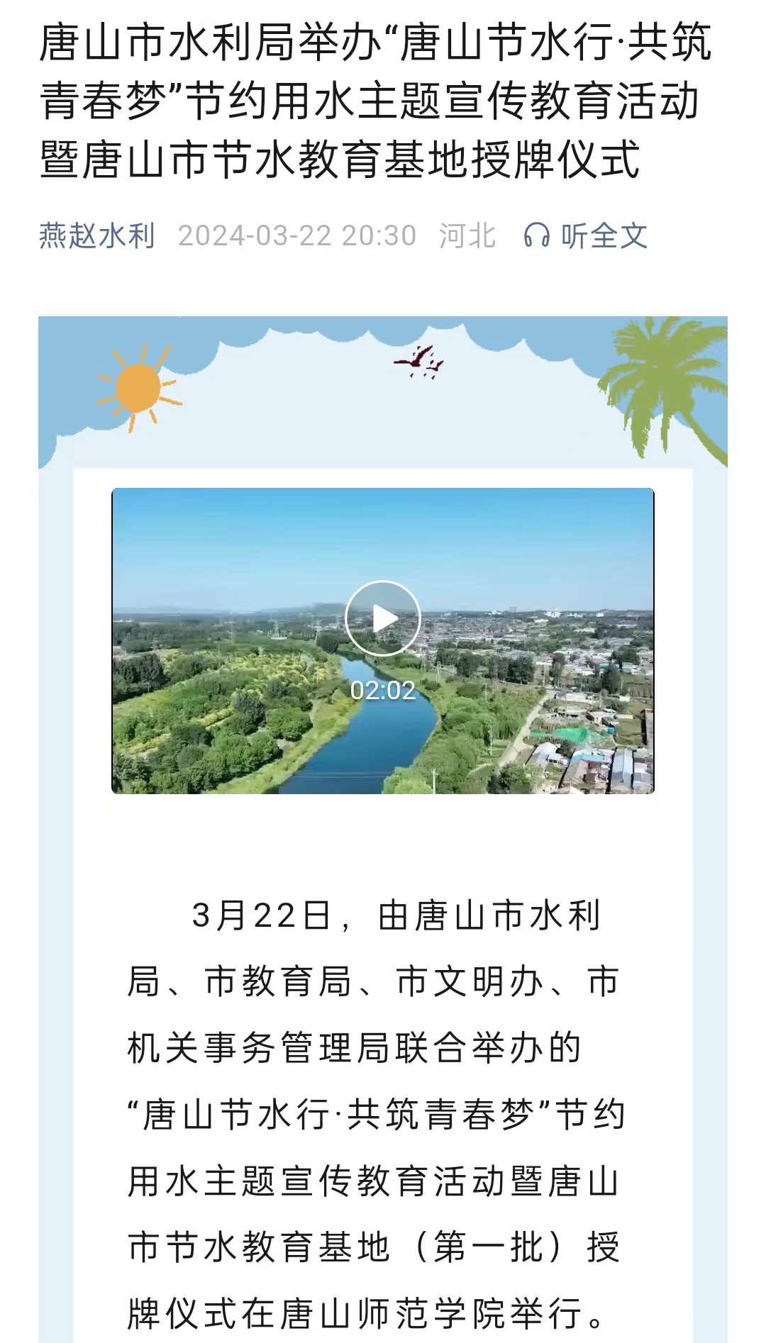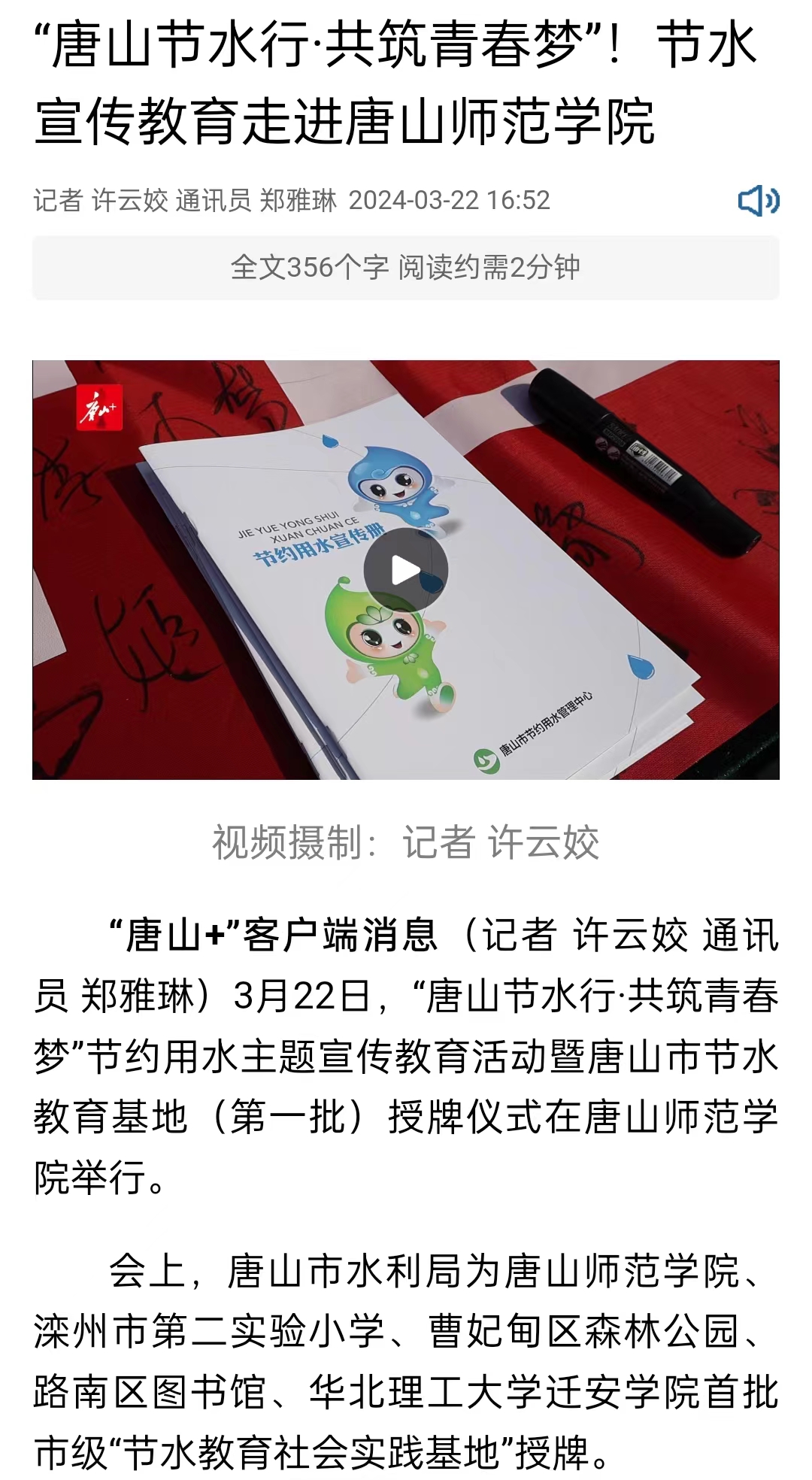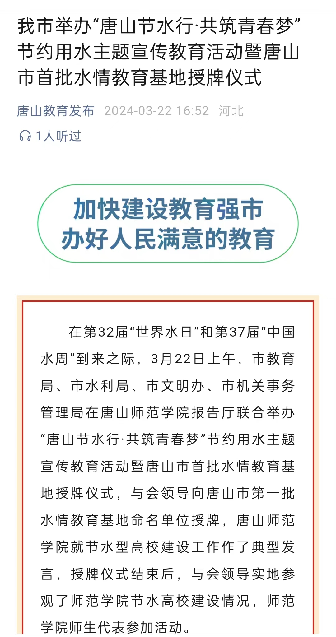 3月22日,由唐山市水利局、市教育局、市文明办、市机关事务管理局联合举办的“唐山节水行·共筑青春梦”节约用水主题宣传教育活动暨唐山市节水教育基地(第一批)授牌仪式在伟德国际victor1946官网举行。伟德国际victor1946官网就节水型高校建设工作作了典型发言,授牌仪式结束后,与会领导实地参观了师范学院节水高校建设情况,师范学院师生代表参加活动。