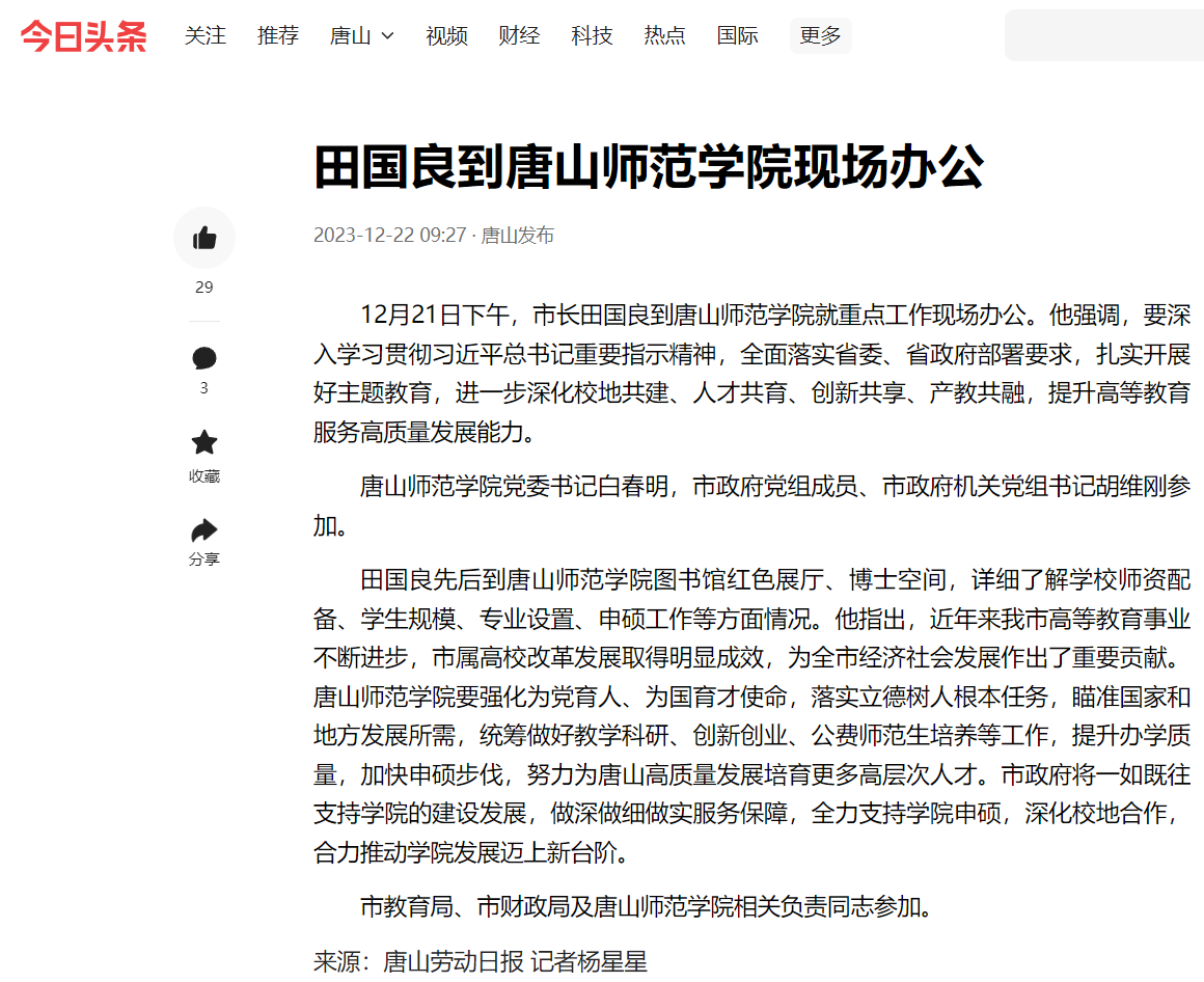 12月21日下午,市长田国良到伟德国际victor1946官网就重点工作现场办公。他强调,要深入学习贯彻习近平总书记重要指示精神,全面落实省委、省政府部署要求,扎实开展好主题教育,进一步深化校地共建、人才共育、创新共享、产教共融,提升高等教育服务高质量发展能力。
