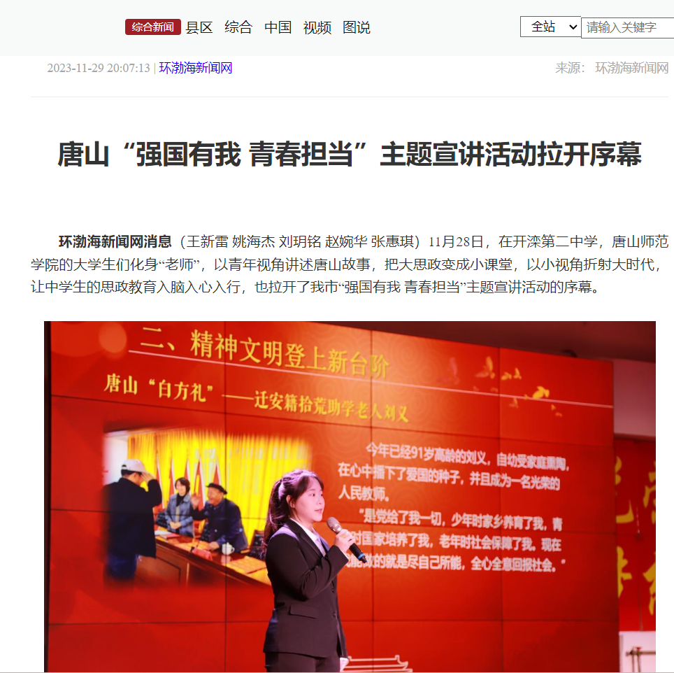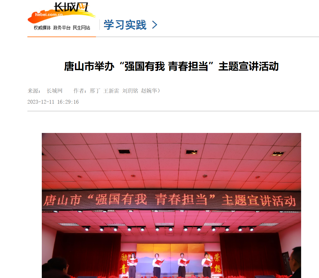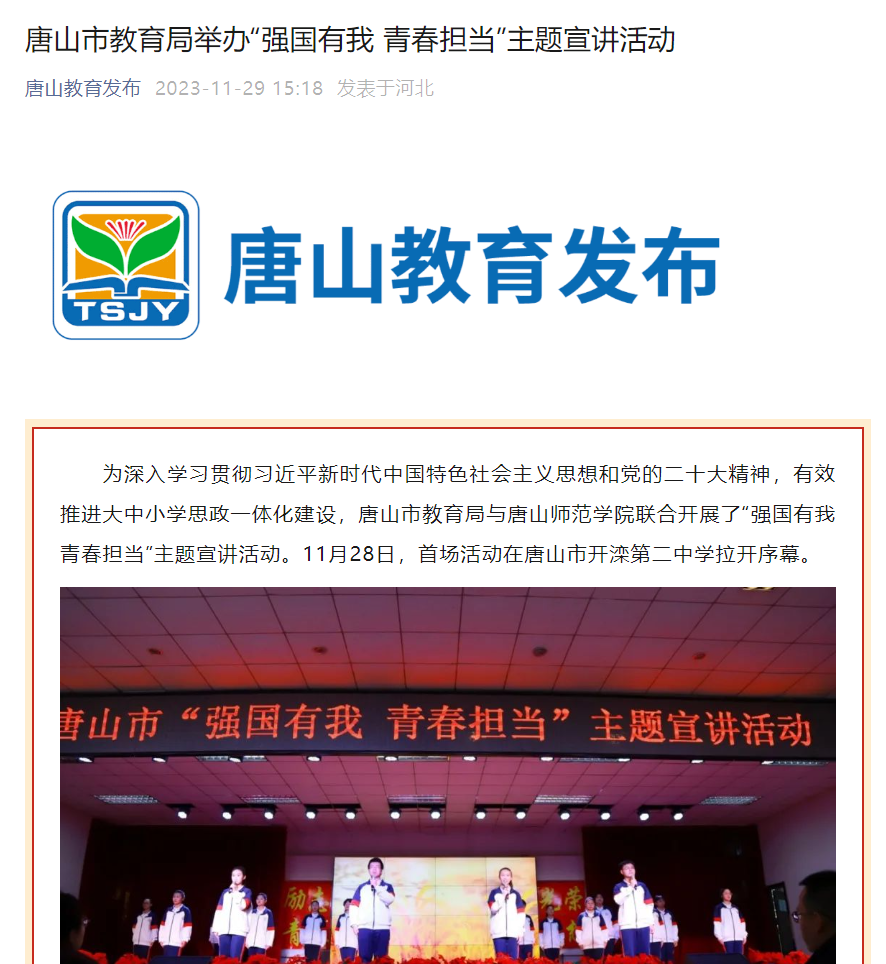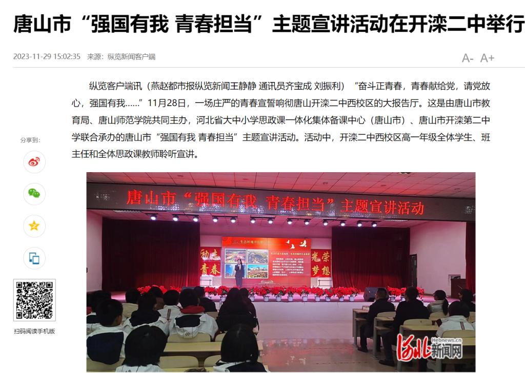 为深入学习贯彻习近平新时代中国特色社会主义思想和党的二十大精神,有效推进大中小学思政一体化建设,唐山市教育局与伟德国际victor1946官网联合开展了“强国有我 青春担当”主题宣讲活动。11月28日,首场活动在唐山市开滦第二中学拉开序幕。该活动已被唐山广播电视台、唐山教育发布报道。
