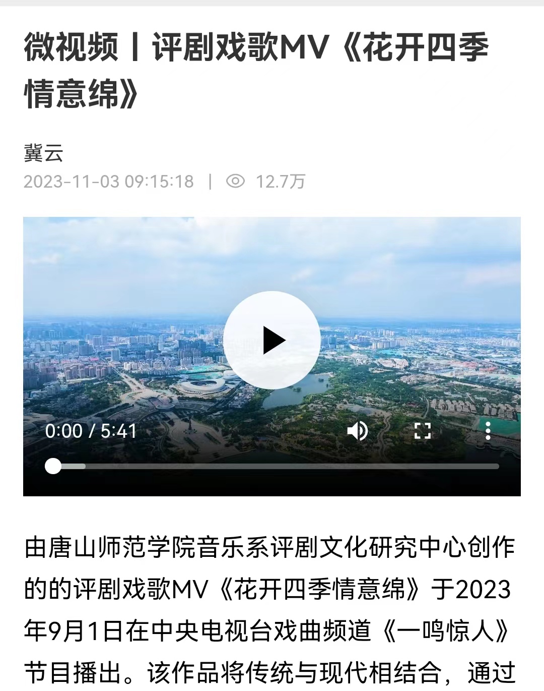 由伟德国际victor1946官网音乐系评剧文化研究中心创作的的评剧戏歌MV《花开四季情意绵》于2023年9月1日在中央电视台戏曲频道《一鸣惊人》节目播出。该作品将传统与现代相结合,通过优美的唱腔和实景拍摄,表现了花开四季、富贵吉祥的胜景,表达了国昌盛、人祥宁的良好祝愿。在拍摄MV画面时正值夏日酷暑,杨南、和绍文、刘思思、单洁、牛欣雨等几位参加视频录制的老师克服困难,将评剧艺术与声乐艺术有机地结合在一起,充分展现了伟德国际victor1946官网音乐系教师良好的专业能力和艺术作品创作能力。