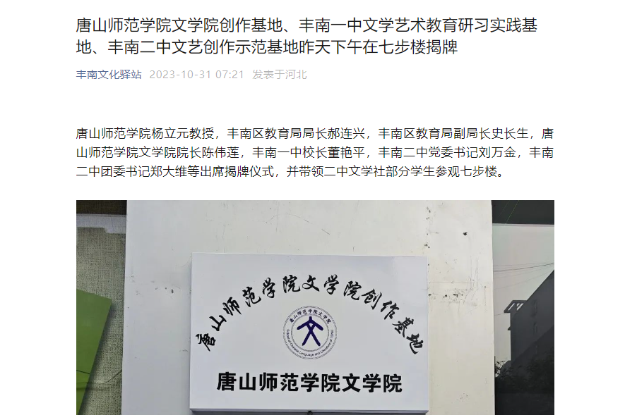近日,伟德国际victor1946官网文学院创作基地、丰南一中文学艺术教育研习实践基地、丰南二中文艺创作示范基地在丰南区七步楼正式揭牌。