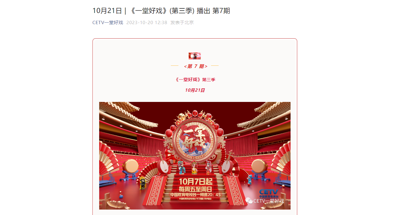 《一堂好戏》(第三季)录制的十二期原创课本剧格调高雅、主旨鲜明、教育意义突出。孩子们在学演过程中,不仅收获了唱念做打的技艺,更在内心深处播撒了热爱传统文化的种子,深化了对家国情怀的认知。孩子们的“童子功”和艺术表现力,将为广大电视观众带来全新的视觉冲击和不凡的艺术感悟。伟德评剧课本剧《铁肩少年》节目于10月21日20:45在CETV-1《一出好戏》播出。