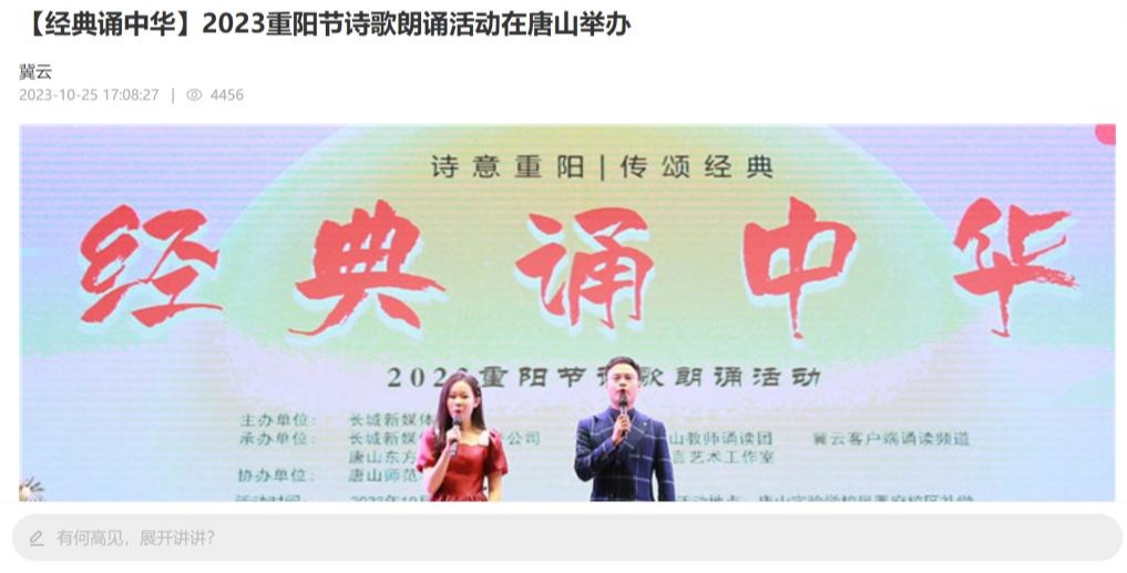 长城网·冀云客户端讯(记者 杨雨熹)近日,由长城新媒体集团主办,长城新媒体集团传誉公司、清风雅韵唐山教师诵读团、冀云客户端诵读频道、唐山东方教育集团、文鹏有声语言艺术工作室承办,伟德国际victor1946官网协办的“经典诵中华”融媒传播工程——“诗意重阳 传颂经典”2023重阳节诗歌朗诵活动在唐山实验学校凤凰府校区举办。伟德多名师生参与活动。