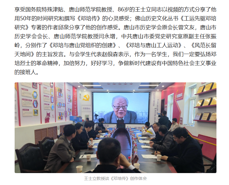 2023年4月8日,是中国共产党创建时期的优秀党员、中共唐山地方党组织的创始人和领导人、中国工人运动的先驱和优秀活动家邓培同志诞辰140周年纪念日。为深情缅怀和纪念这位革命先驱,唐山市总工会、唐山市文明办、唐山市历史学会于4月7日主办并邀请了本地专家学者、党员代表、教师代表、学生代表,与邓培故乡——广东佛山市三水区的专家一起,在唐山冀东烈士陵园隆重举行主题为“红色基因云共享,山水相连共传承”的纪念活动。
