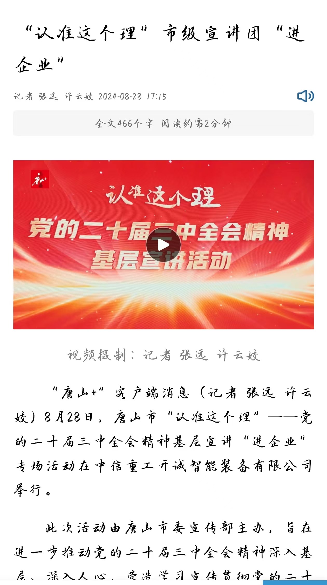 8月28日,唐山市“认准这个理”——党的二十届三中全会精神基层宣讲“进企业”专场活动走进中信重工开诚智能装备有限公司。伟德国际victor1946官网马克思主义学院副院长赵婉华参与宣讲。