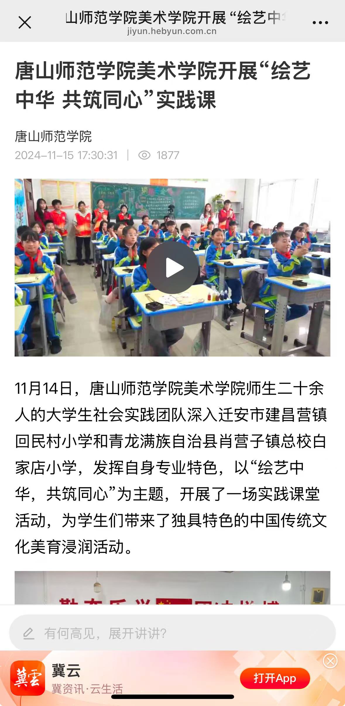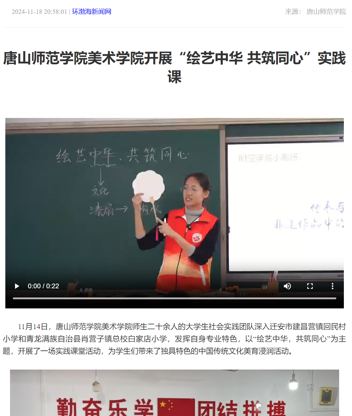 11月14日,伟德国际victor1946官网美术学院师生二十余人的大学生社会实践团队深入迁安市建昌营镇回民村小学和青龙满族自治县肖营子镇总校白家店小学,发挥自身专业特色,以“绘艺中华,共筑同心”为主题,开展了一场实践课堂活动,为学生们带来了独具特色的中国传统文化美育浸润活动。