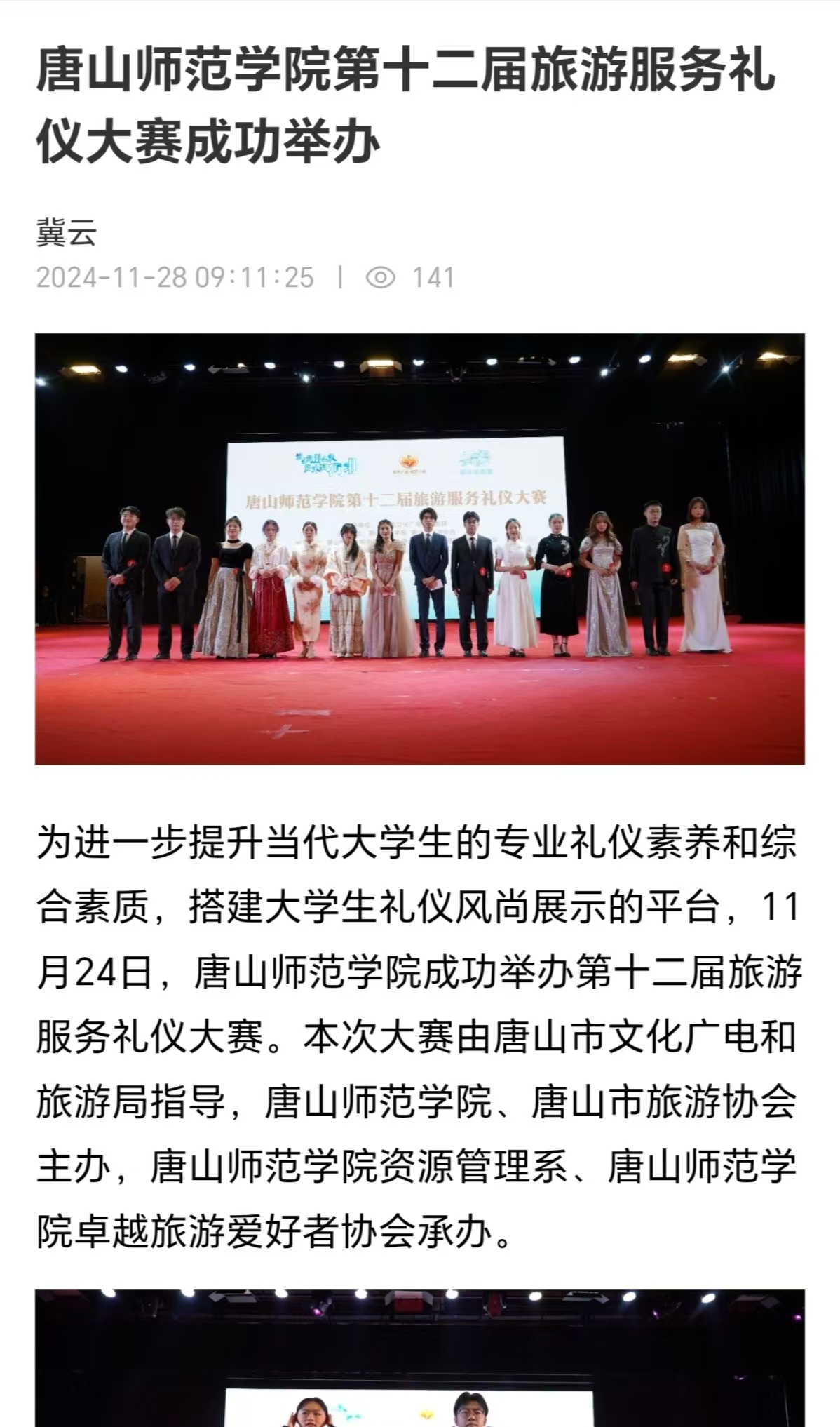为进一步提升当代大学生的专业礼仪素养和综合素质,搭建大学生礼仪风尚展示的平台,11月24日,伟德国际victor1946官网成功举办第十二届旅游服务礼仪大赛。本次大赛由唐山市文化广电和旅游局指导,伟德国际victor1946官网、唐山市旅游协会主办,伟德国际victor1946官网资源管理系、伟德国际victor1946官网卓越旅游爱好者协会承办。