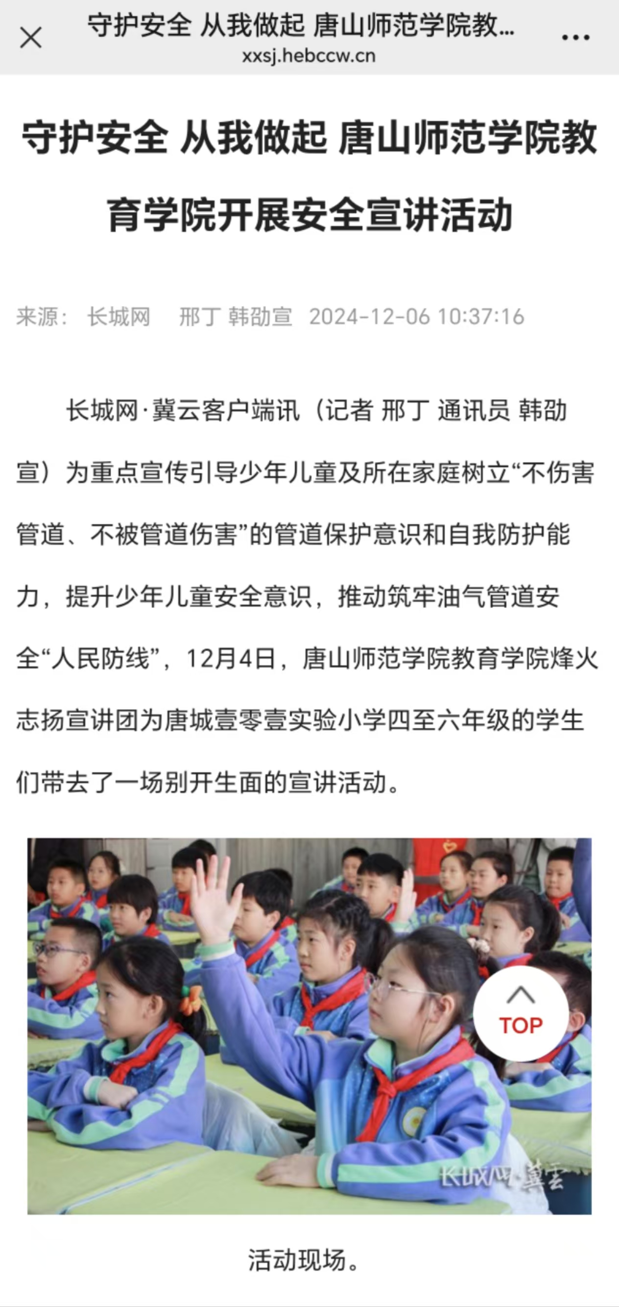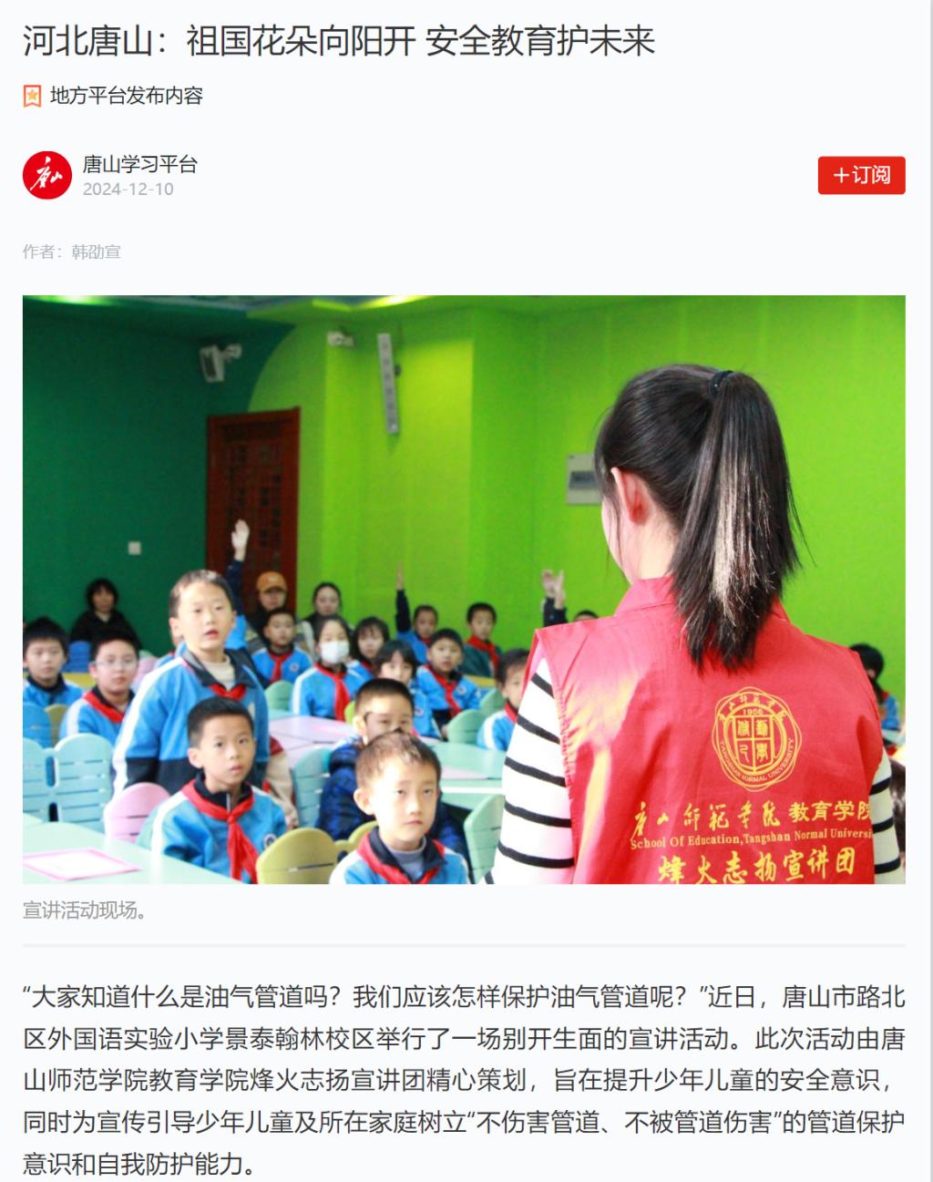 为重点宣传引导少年儿童及所在家庭树立“不伤害管道、不被管道伤害”的管道保护意识和自我防护能力,提升少年儿童安全意识,推动筑牢油气管道安全“人民防线”,12月4日,伟德国际victor1946官网教育学院烽火志扬宣讲团为唐城壹零壹实验小学四至六年级的学生们带去了一场别开生面的宣讲活动。