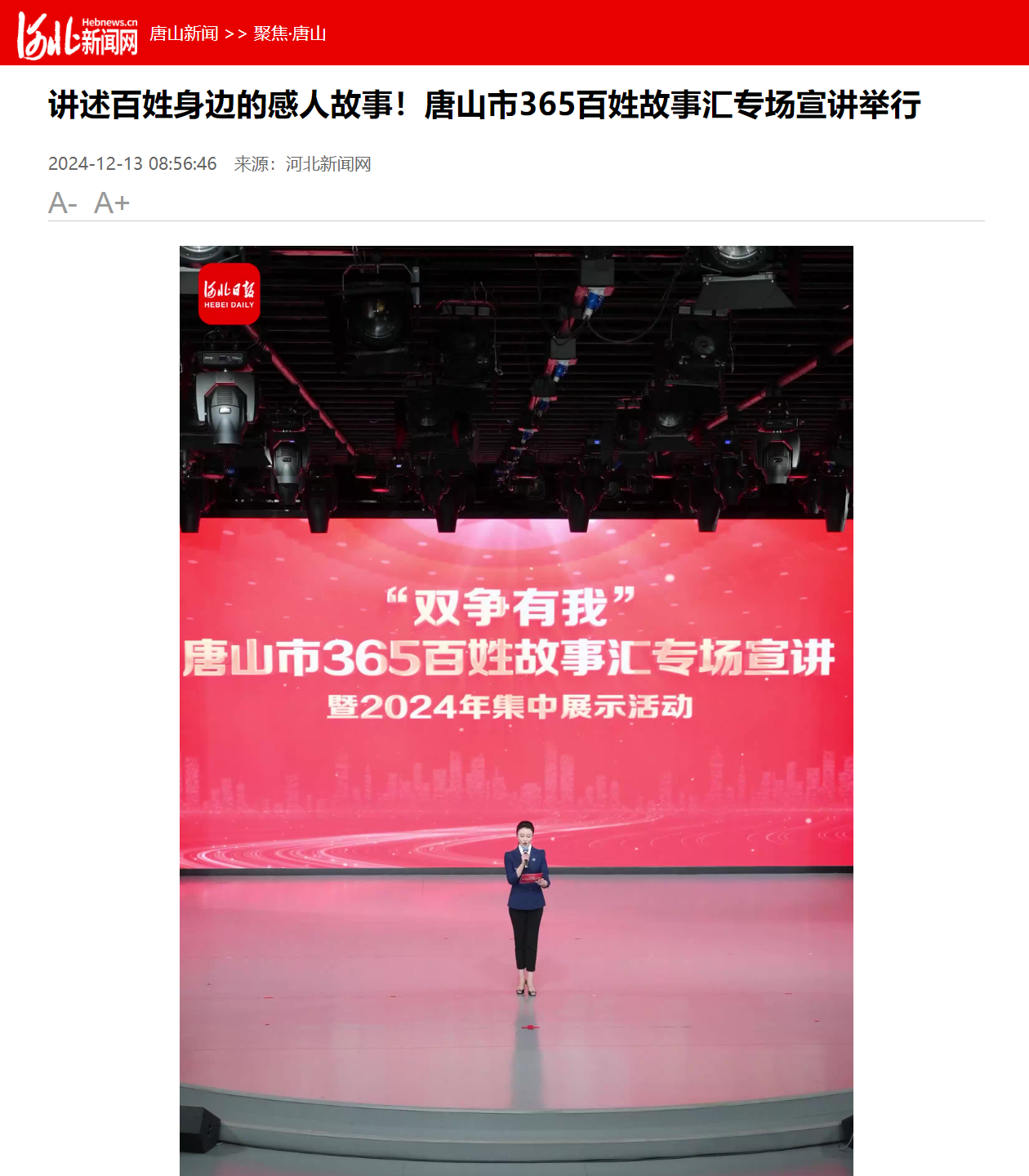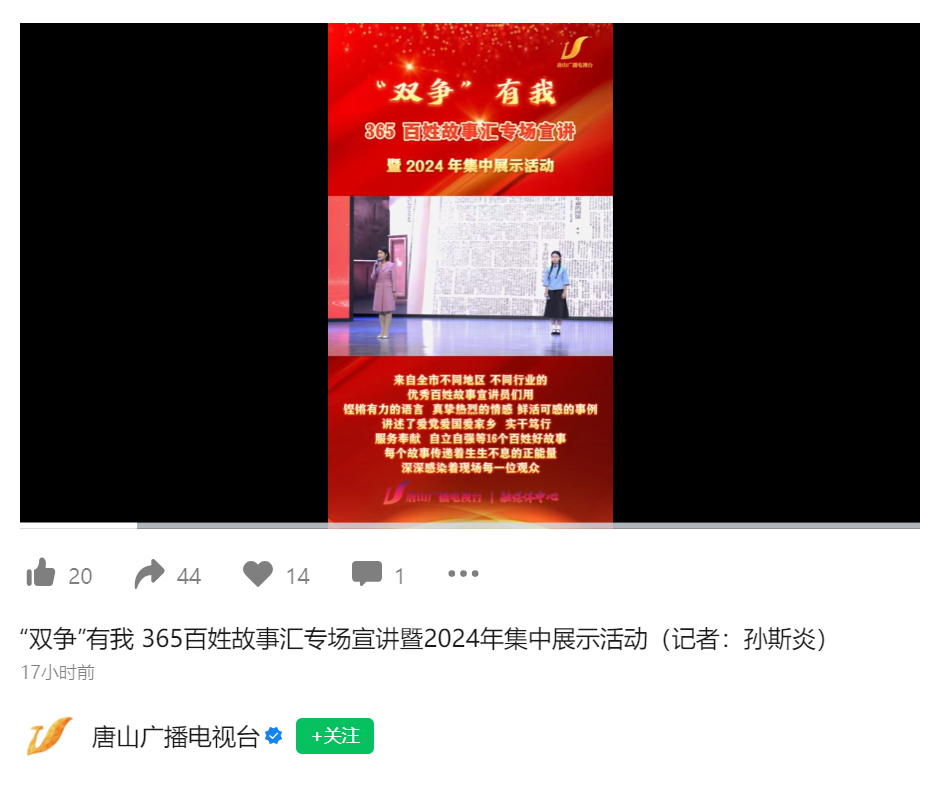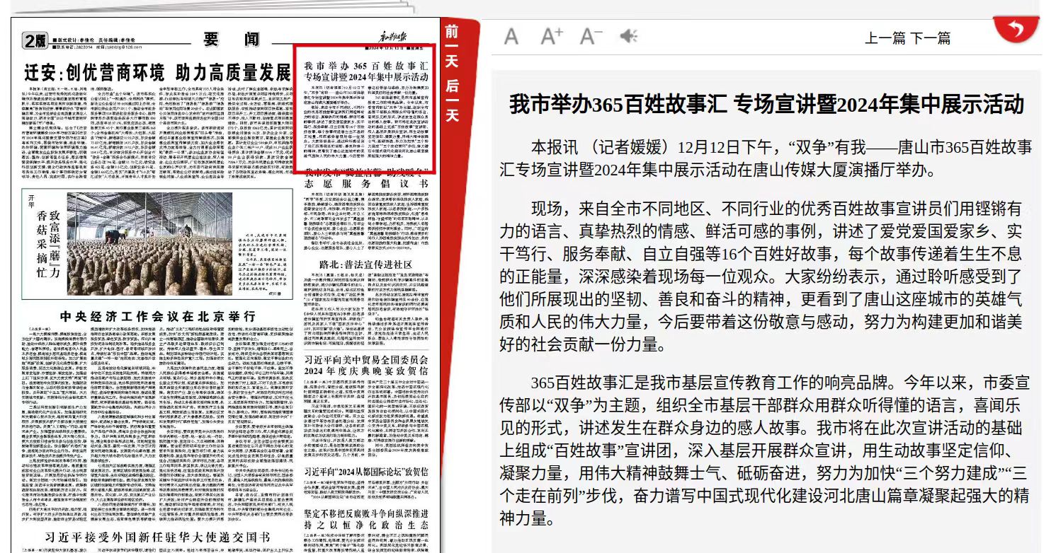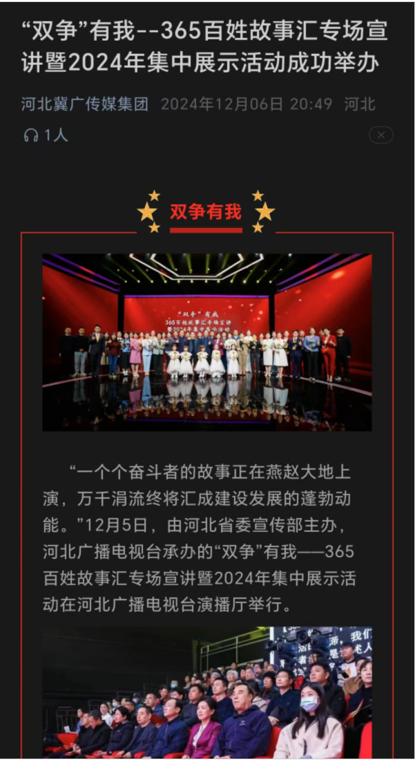 12月12日,“双争”有我——唐山市365百姓故事汇专场宣讲暨2024年集中展示活动在唐山传媒大厦演播厅举办,伟德宣讲员参与此次活动。