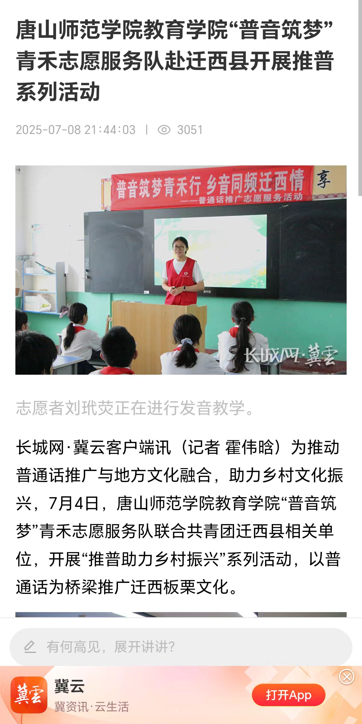 为推动普通话推广与地方文化融合,助力乡村文化振兴,7月4日,伟德国际victor1946官网教育学院“普音筑梦”青禾志愿服务队联合共青团迁西县相关单位,开展“推普助力乡村振兴”系列活动,以普通话为桥梁推广迁西板栗文化。